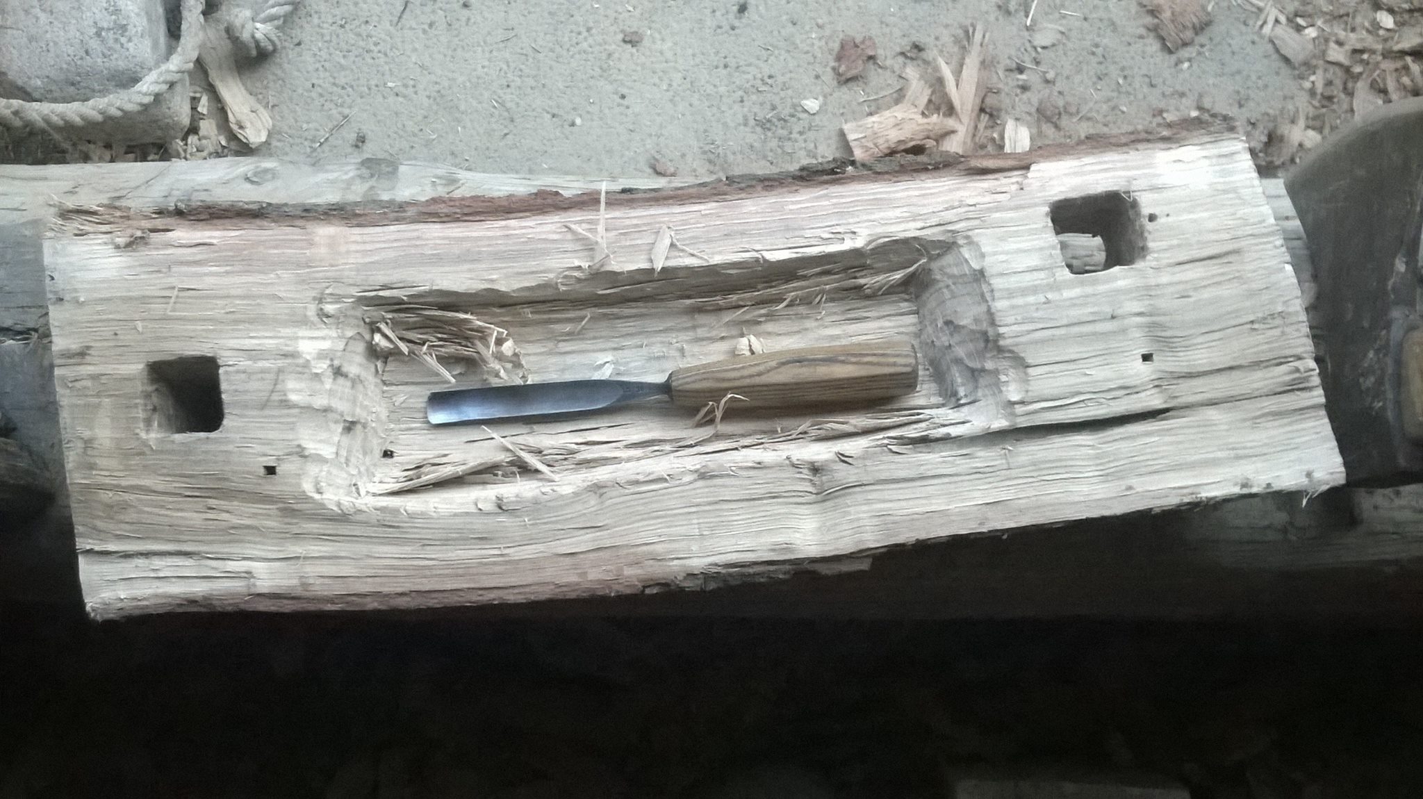 Next using only axe, adze and two chisels I carved hollows for treasure and holes for lock pegs.
