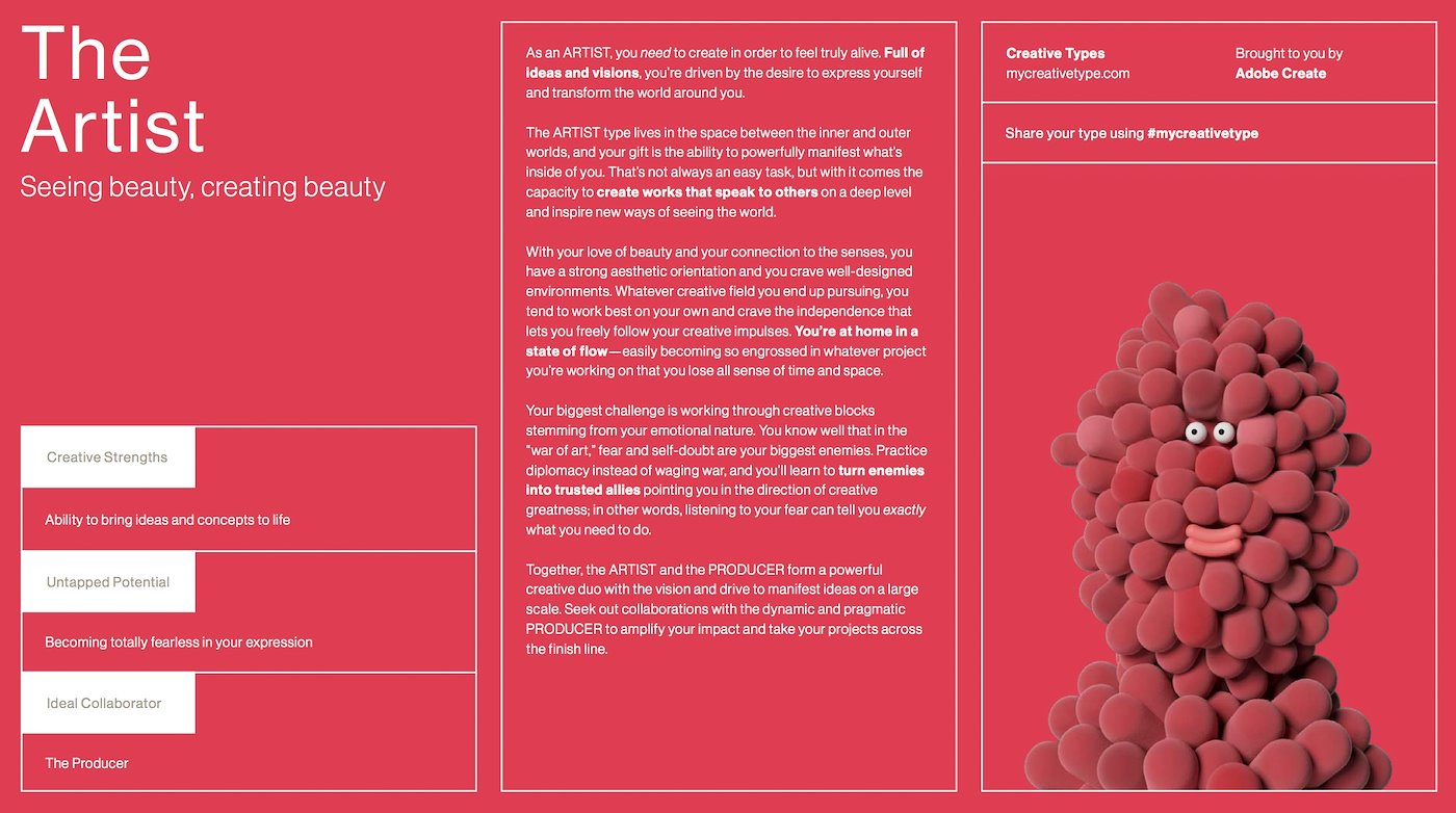 Yesterday morning I got an invite through LinkedIN for a test provided by Adobe. Through a series of questions, Adobe determines the Creative Type category of the testee.