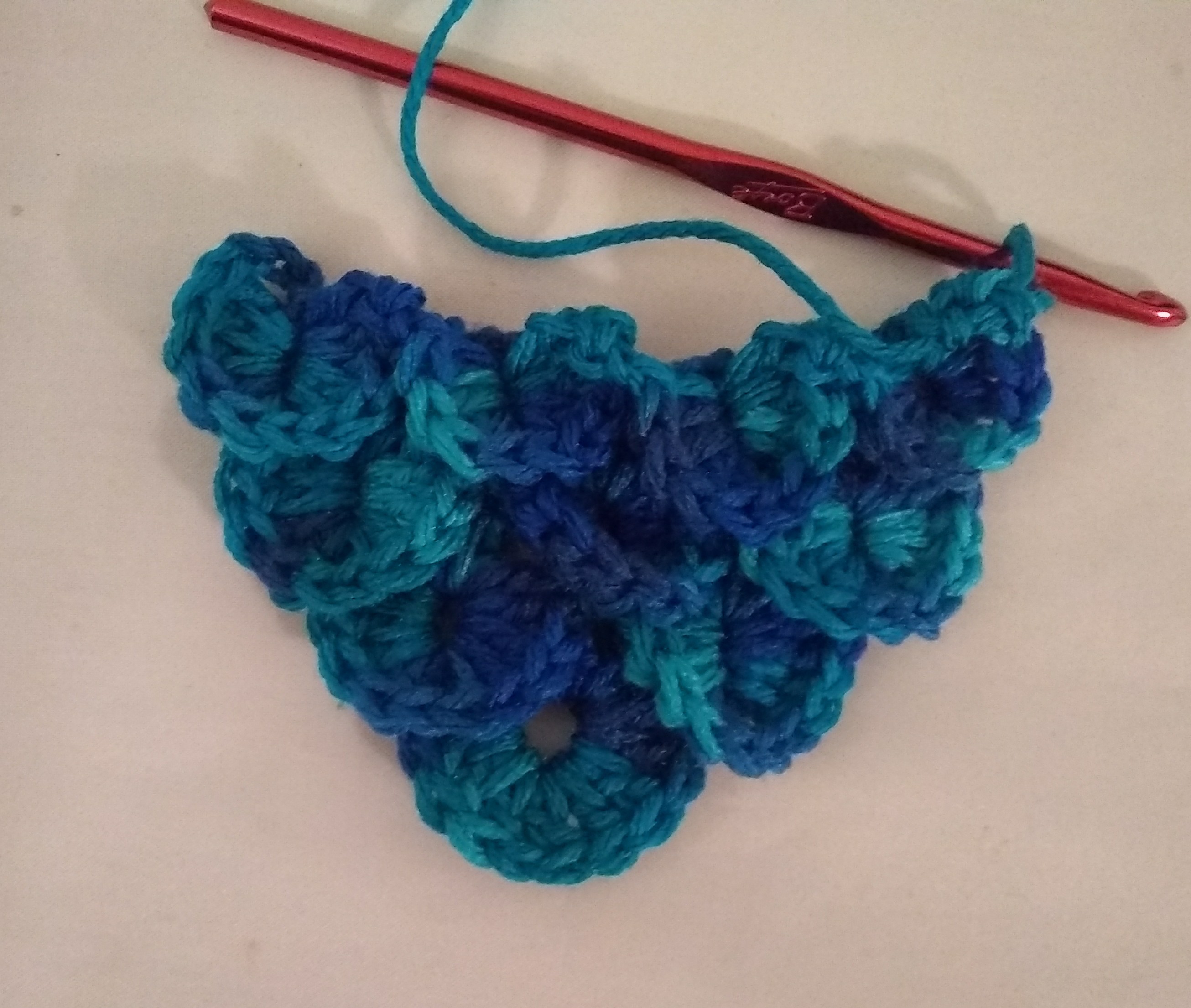The video I'm following puts a twist on the stitch tho - it's done from the corner, and expands out. Basically you do 1 croc stitch, a foundation row (more double crochets) and then 2 croc stitches - repeat the foundation row, 3 croc stitches - and you get the idea. Go as wide as you want, then decrease (that's so misleading to me, to me it's "don't increase further" which is not the same as a decrease. Decrease would actually make it smaller, not stay the same) when you have it as wide as you want it.