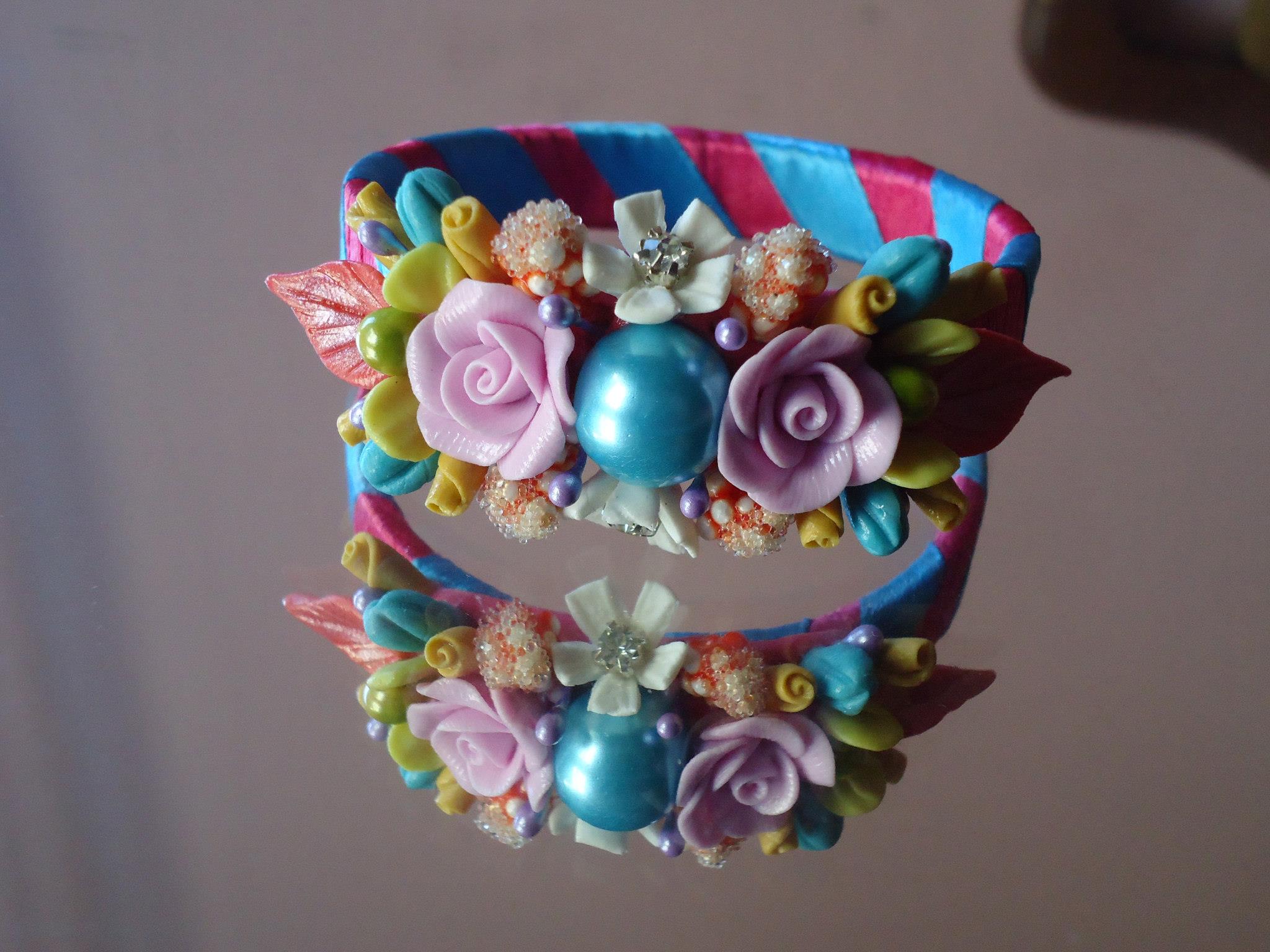 I used ribbons to cover the base of bangles and then I decorated flowers on each bangle according to requirements.