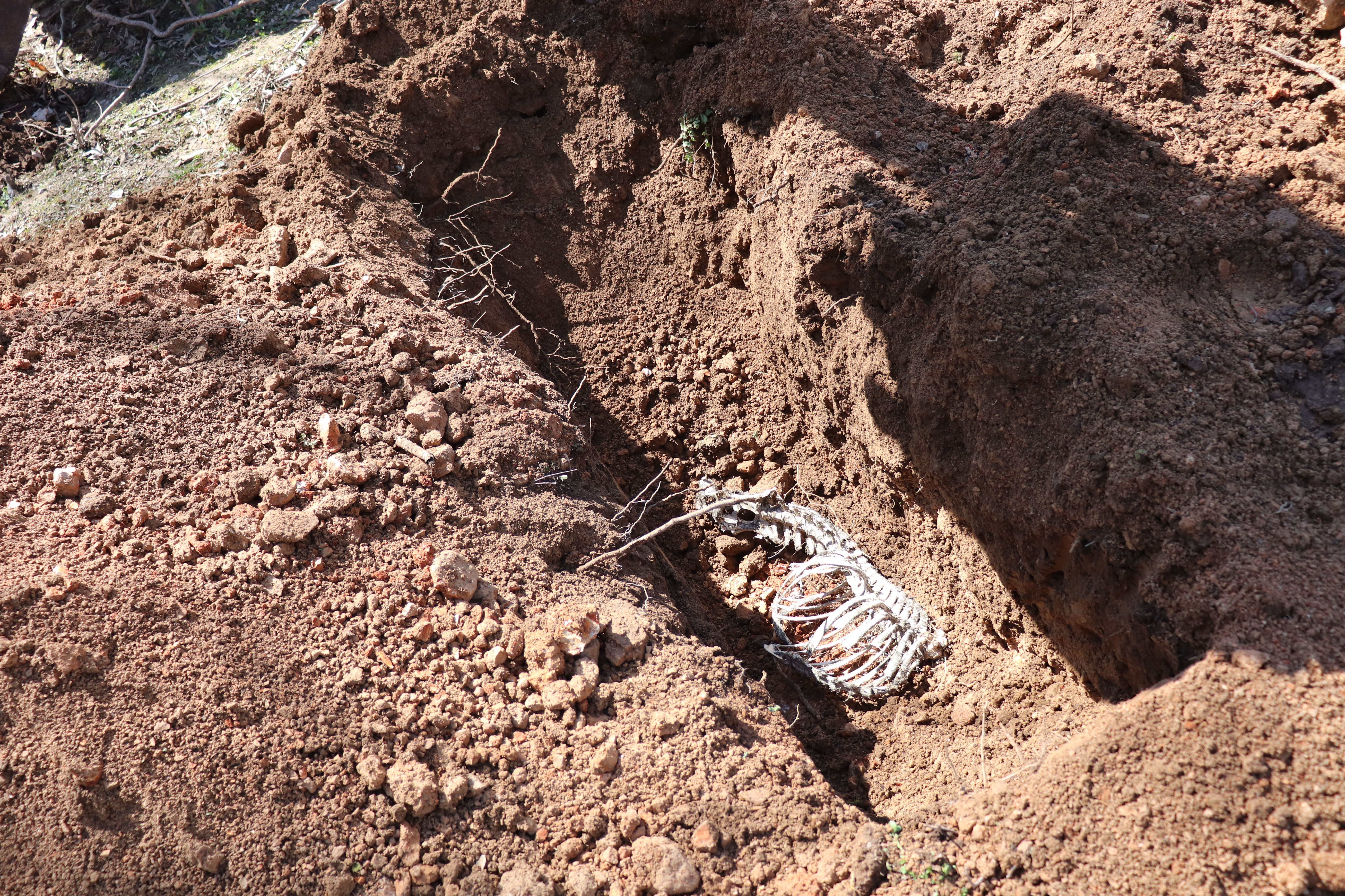 After the deep hole was dug, it was ready for the bones. Grapes can grow deep roots, so I "planted" the carcass a few feet deep. This way it was also deep enough to avoid trouble with dogs and other scavengers.