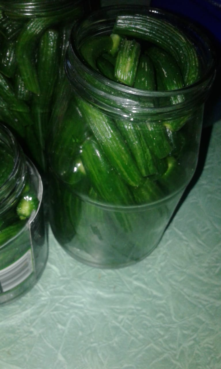 Once the sauce had cooled down to slightly above room temperature, I started filling the bottles, I let them stand for a bit and tapped them with a knife handle on the side to make sure that there was no air-bubbles stuck in-between the cucumbers, then I topped up the bottles and tightly sealed them, wiped them and placed them lid side down on the table.