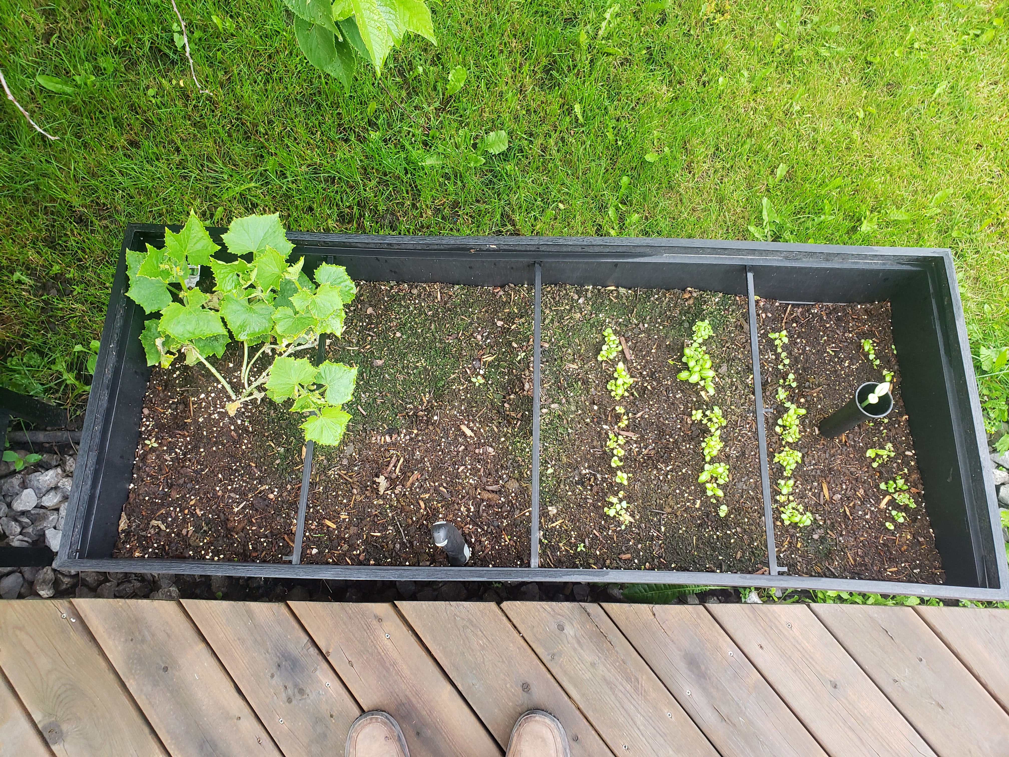 The second planter isn't nearly as abundant. On the right is supposed to be basil, which just never took off this year. It is growing slowly but at this rate I don't think we will get much of a harvest this year. On the left we have a cucumber plant. I'm still pretty hopeful we will get a full cucumbers out of it.
