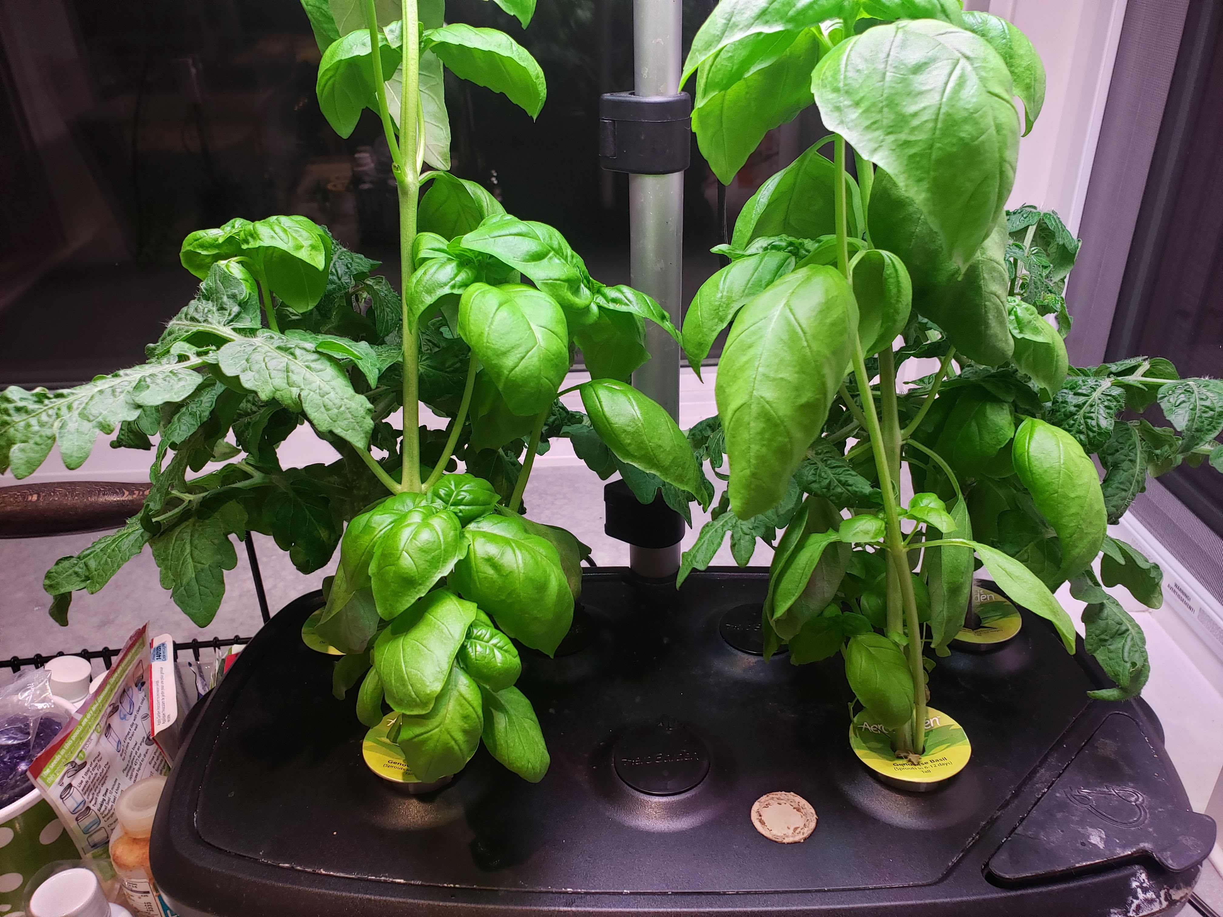 The tomatoes are being invaded by the basil right now. Especially on the left side, the basil plant has a very prominent lean towards the window. I've only been running my lights for 12 hours each day so I guess it's possible the plants are wanting more sunlight right now. The days are still super long here so I don't plan on running the lights any longer right now.