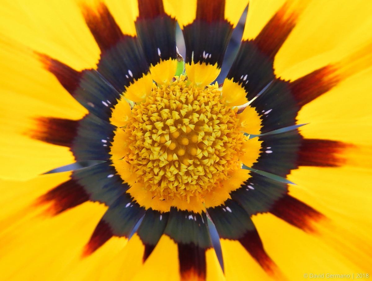 Description: The perfect and stunning symmetry inside the treasure-flower (Gazania rigens ). This photo was taken in the public garden of Mina de São Domingos (Baixo Alentejo region, Southern Portugal).
