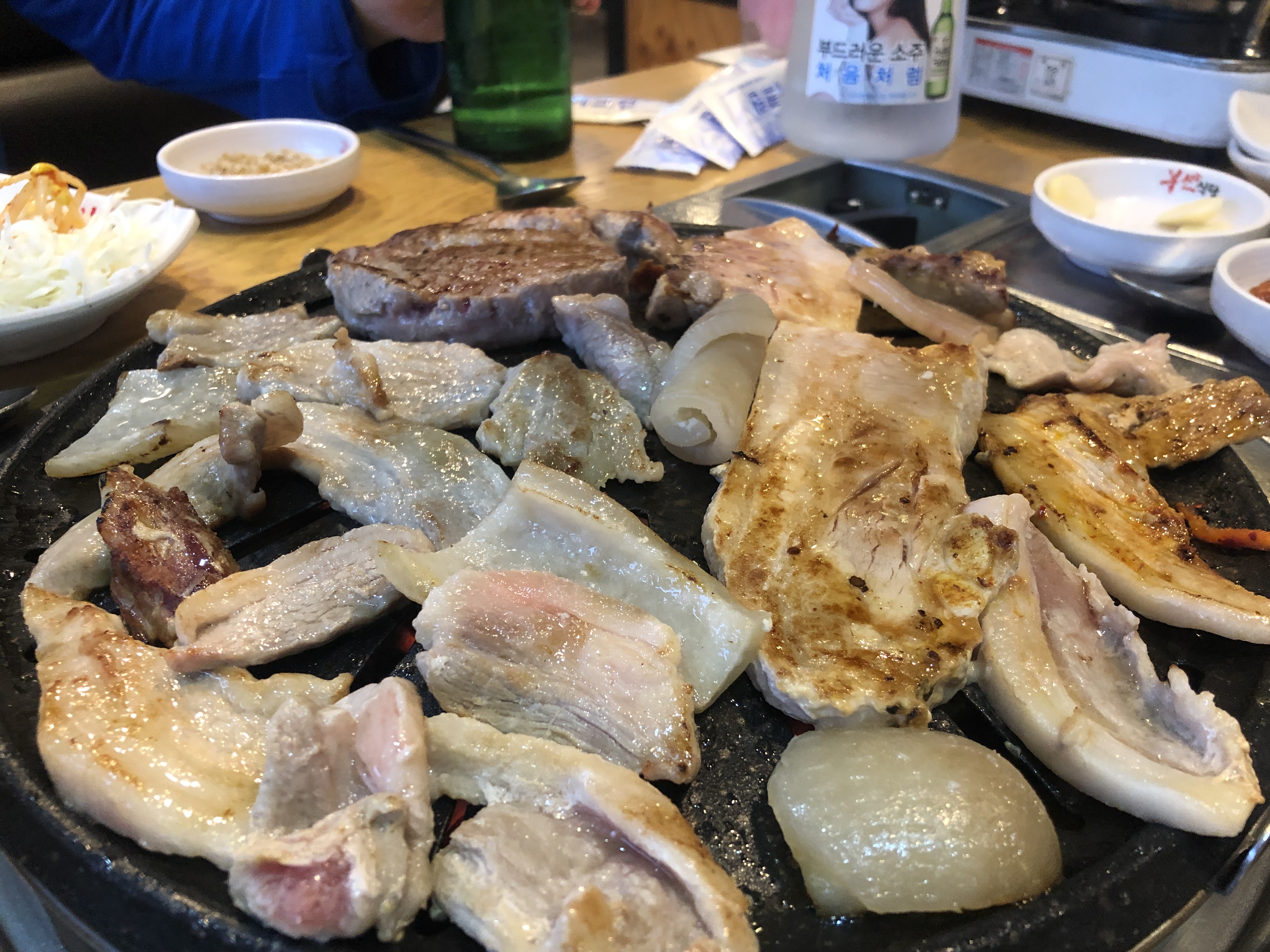 This is Korean style pork bbq on the grill. You can see different parts of pork in the photo, including pork belly, skin, and skirt meat. :)