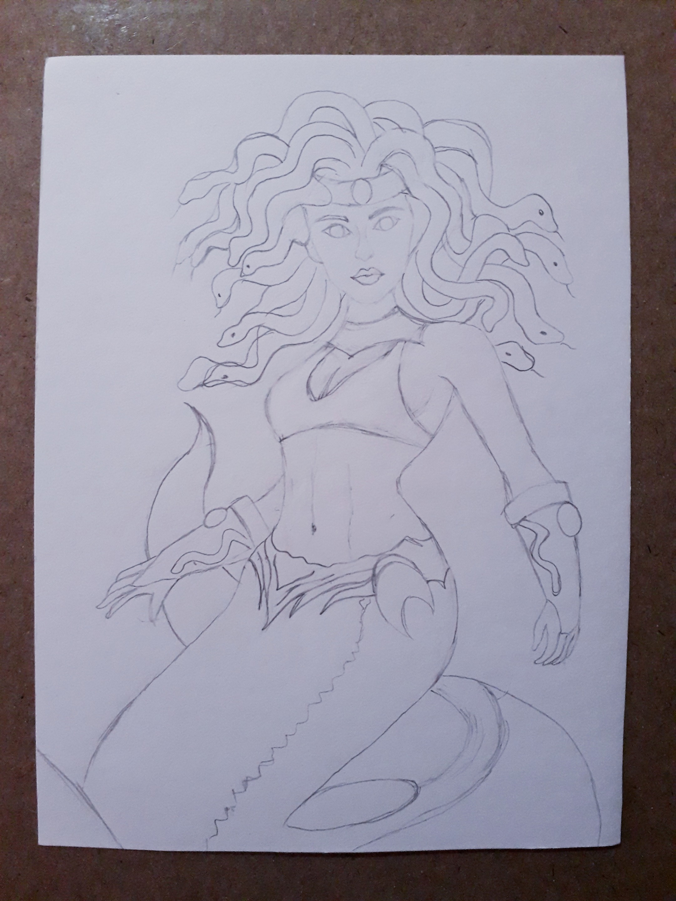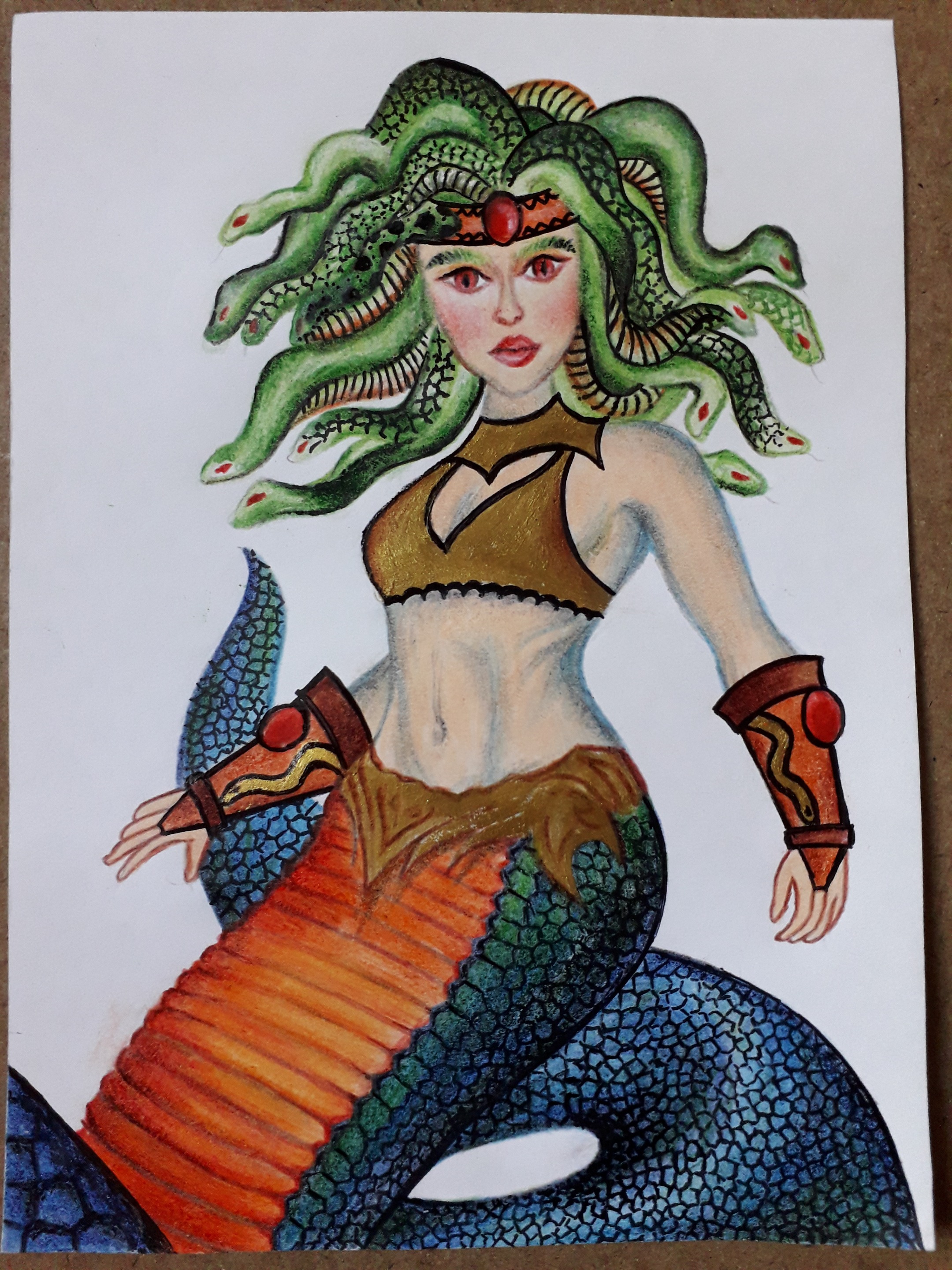 I decided to take a little risk by recreating the character on my card and make some changes in the appearance by making a more adult version of Medusa. I also added some effects and textures to make it look a little more real. As always, I use colored pencils and some markers to create my illustrations.