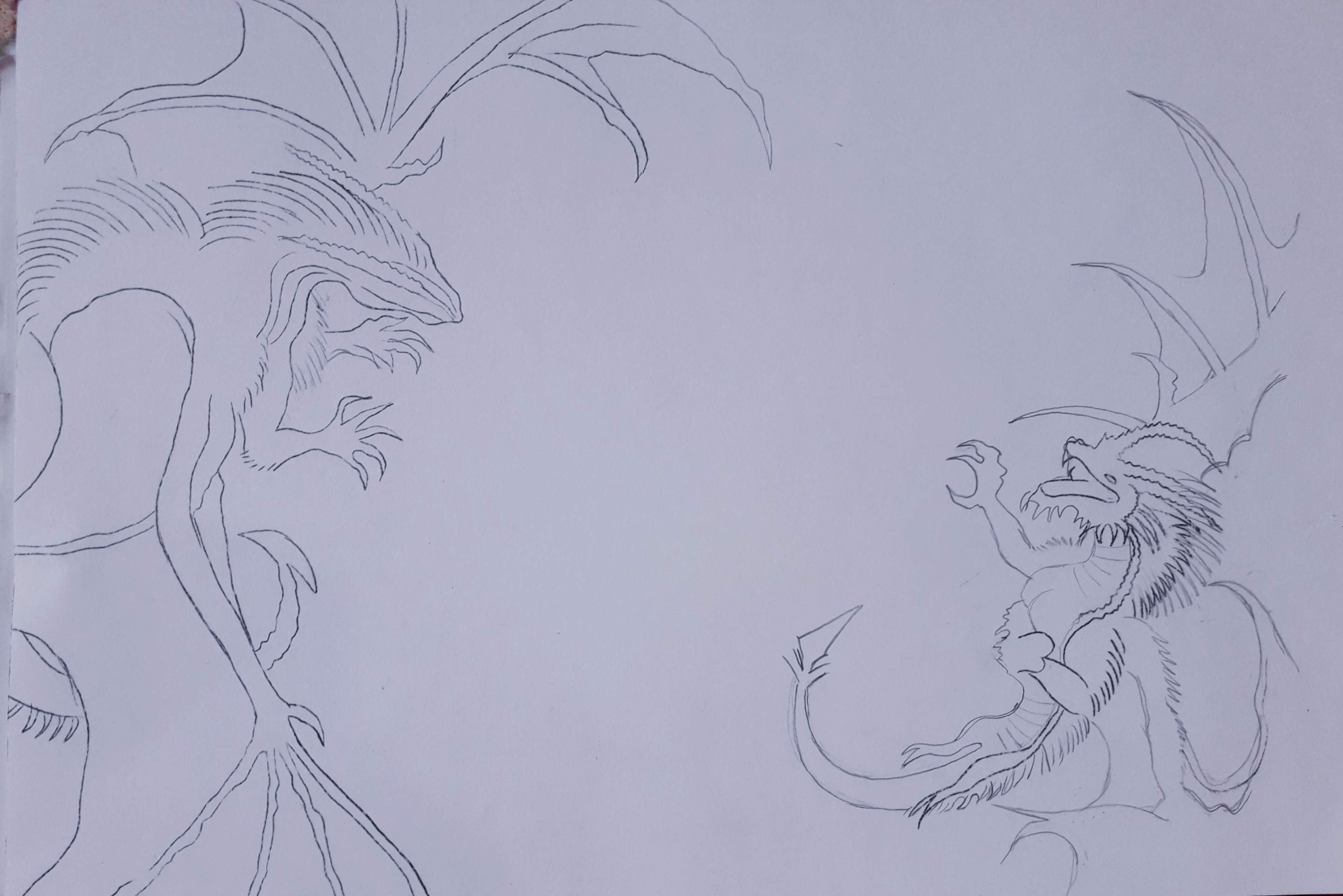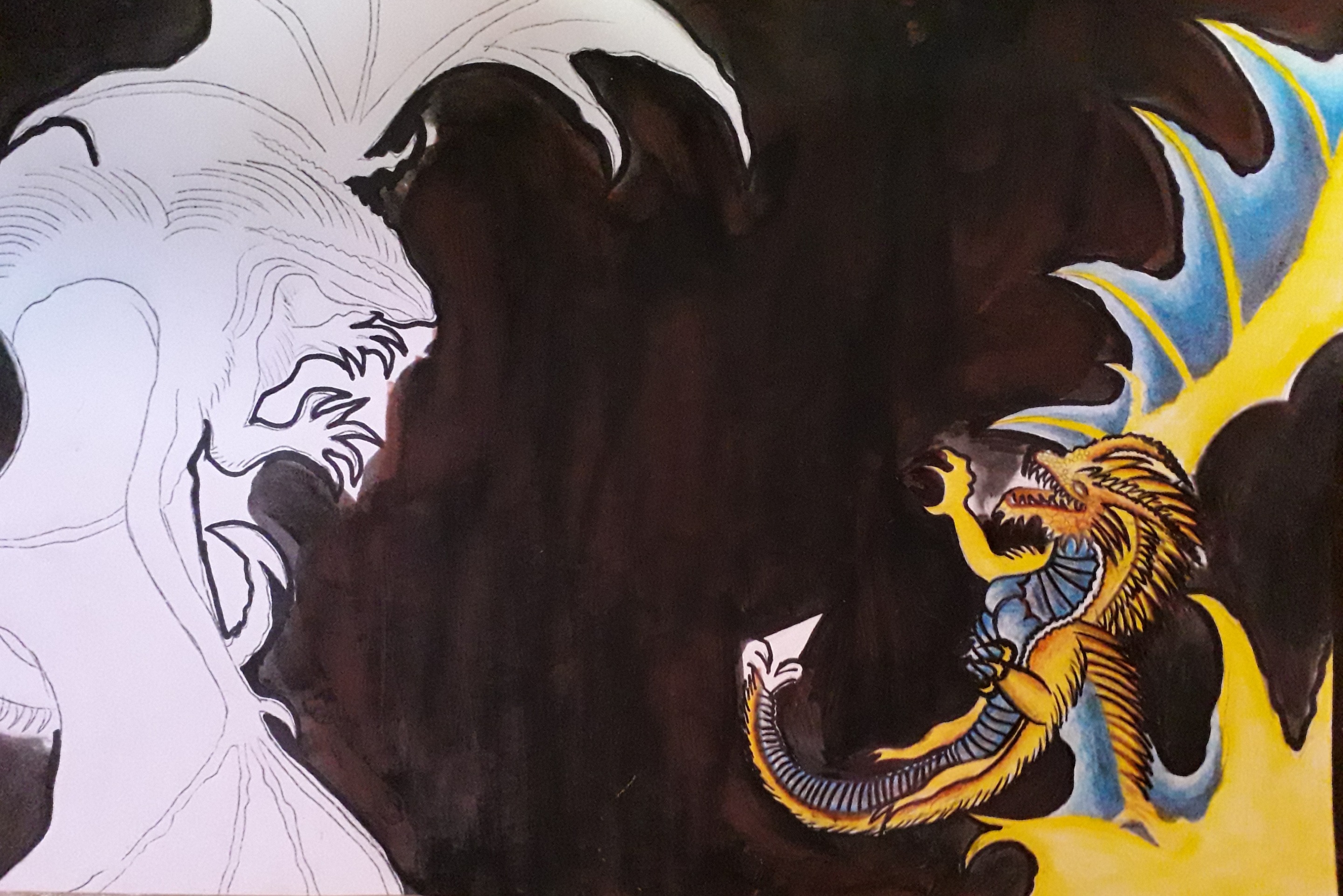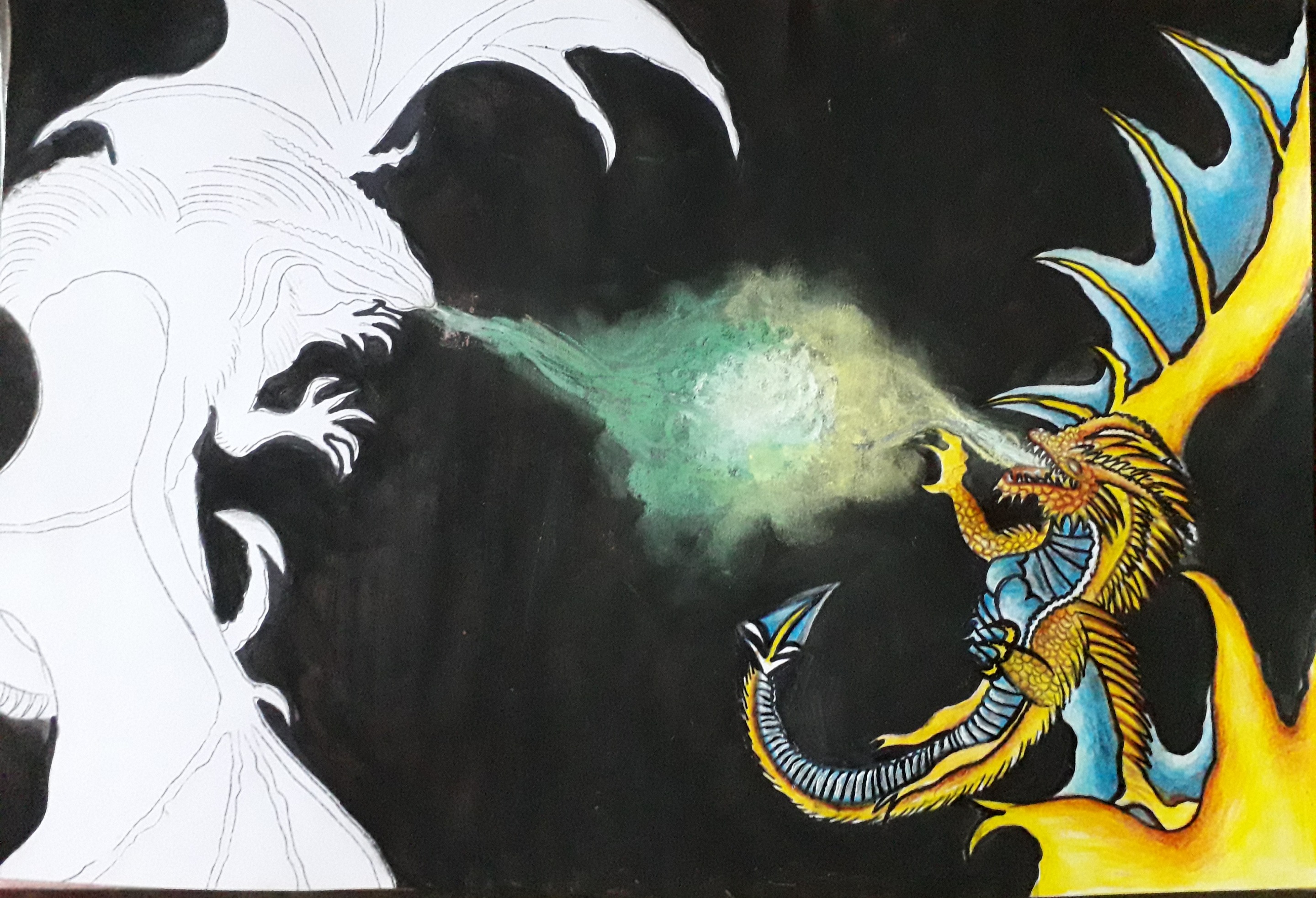 I decided to take a risk by recreating these two dragons and making some changes in their appearance. I also added some effects and textures to give both of them my own touch. As always, I use colored pencils, markers and some paint for the background of my illustrations.