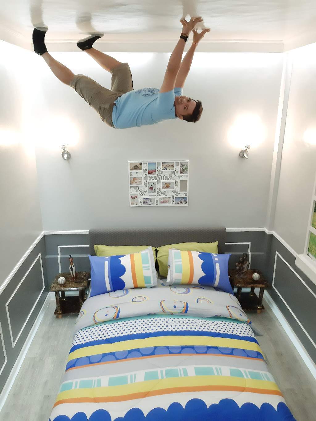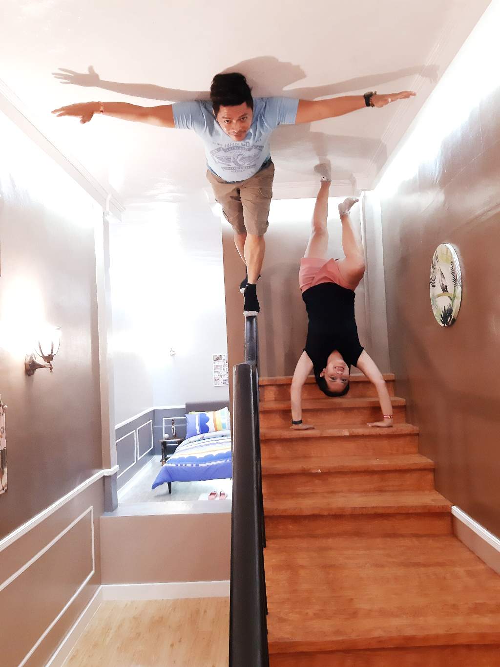 The hubs started crawling into other room. He was acting as the spiderman. He seems to be enjoying it.