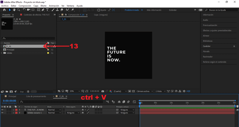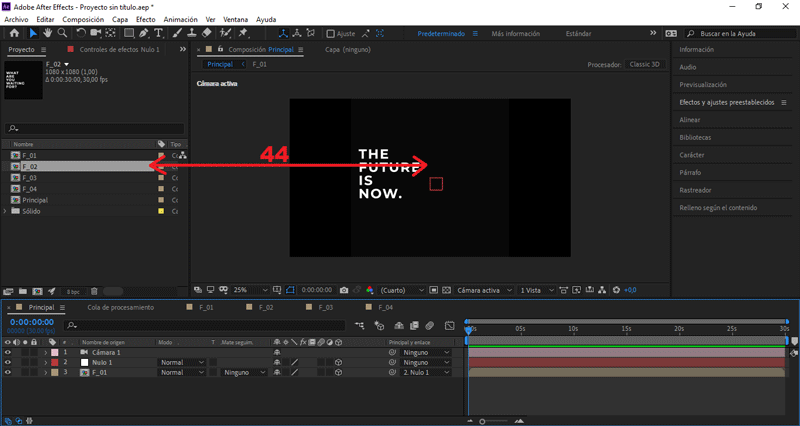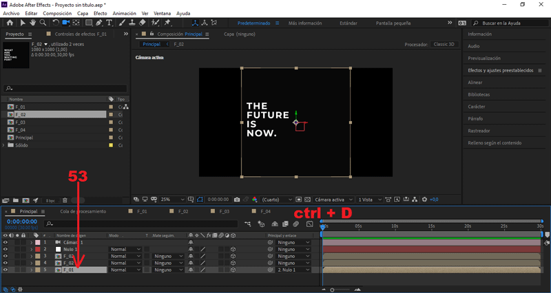 Seleccionamos la composición «F_01», presionamos ctrl + D.