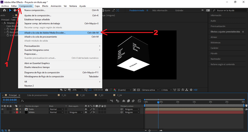 Presionamos Composición/Añadir a cola de Adobe Media Encoder...