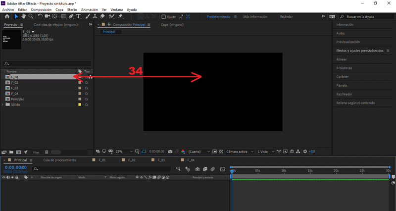 Arrastramos la composición «F_01» hacía la mesa de trabajo.