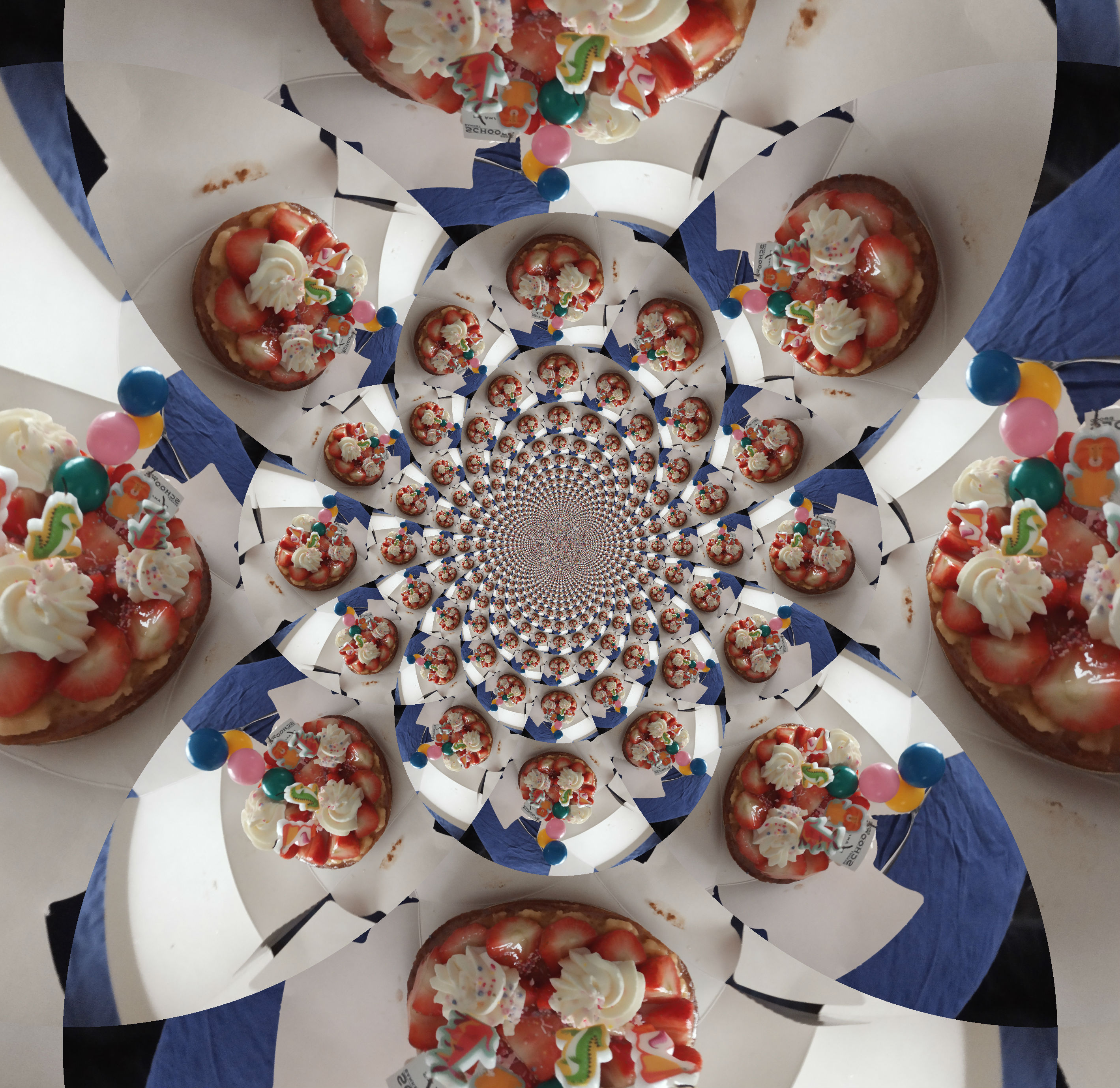 The kaleidoscope effect I used on the picture reflects the cake in a symmetrical pattern. Can you count how many cakes the reflections made.....Don't ask me.....I am not crazy enough to go count them.....But maybe you are.....Let me know how many there are 😋