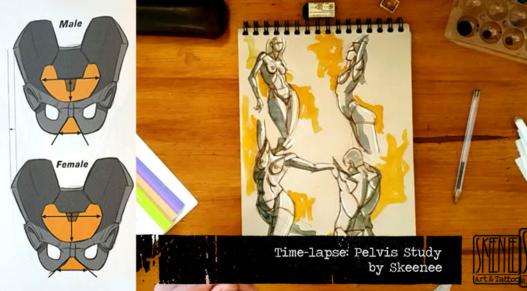 In today´s time-lapse I am studying the pelvis (hip bone). I am quickly sketching a few poses from photo references, paying mostly attention to the inclination of the hip and the landmarks of the pelvis. I try to determine its orientation, and the muscles that are attached to it.