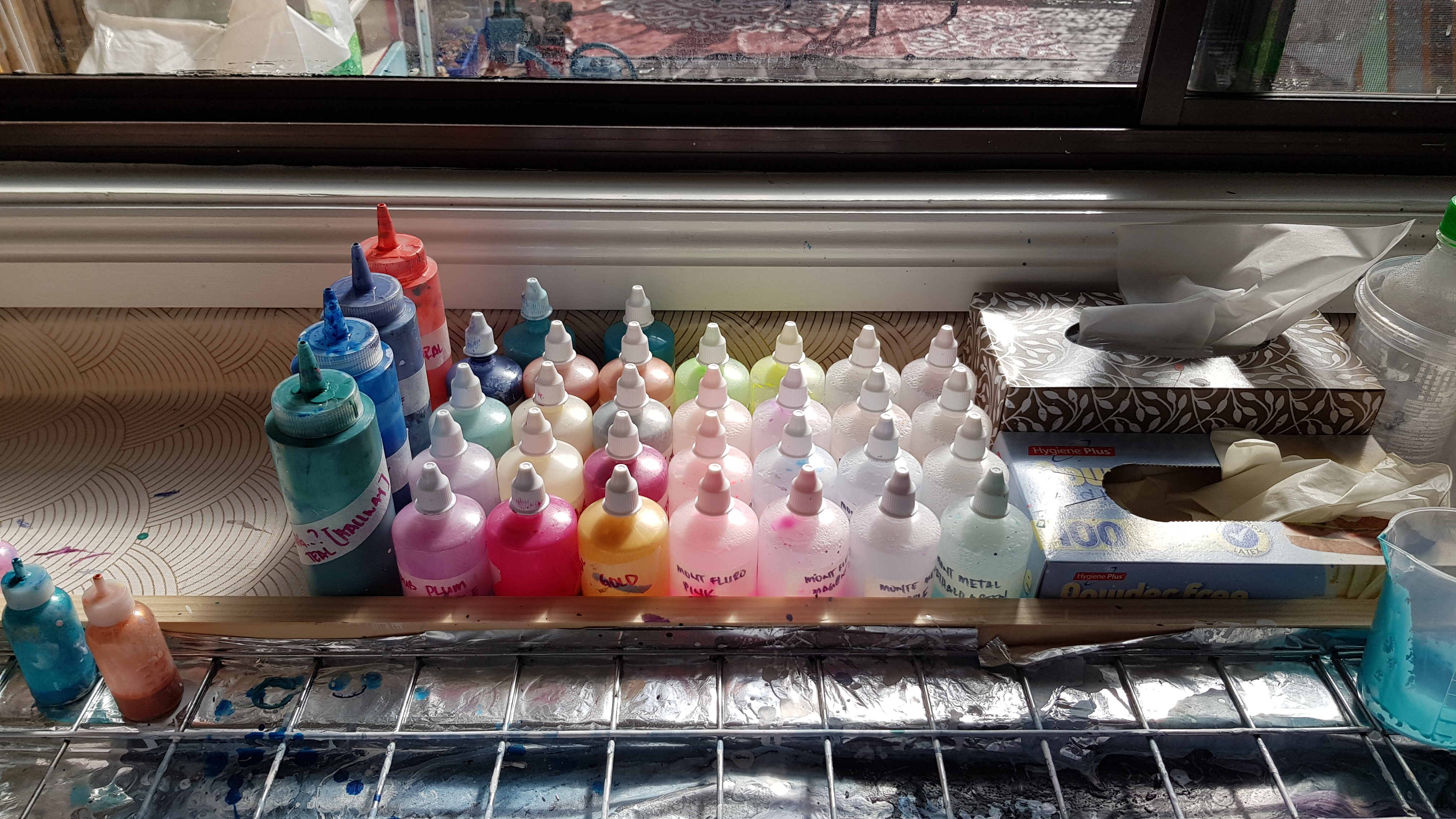 I'm also using a new pouring medium mix with pva, water and floetrol ~ not only to stretch and save on floetrol but to also achieve the nice glossy finish that's achieved by adding pva glue.