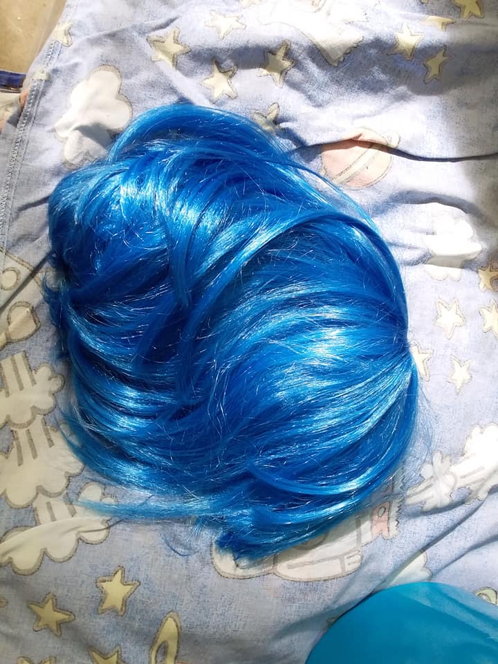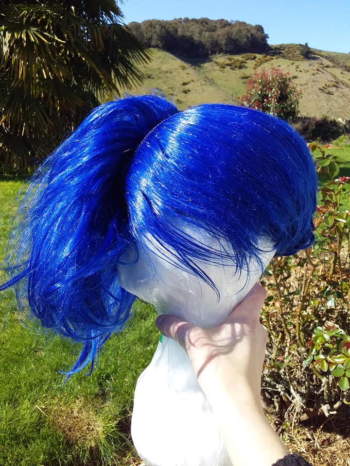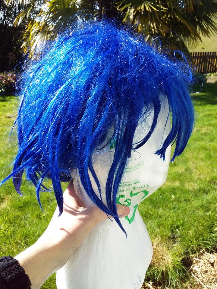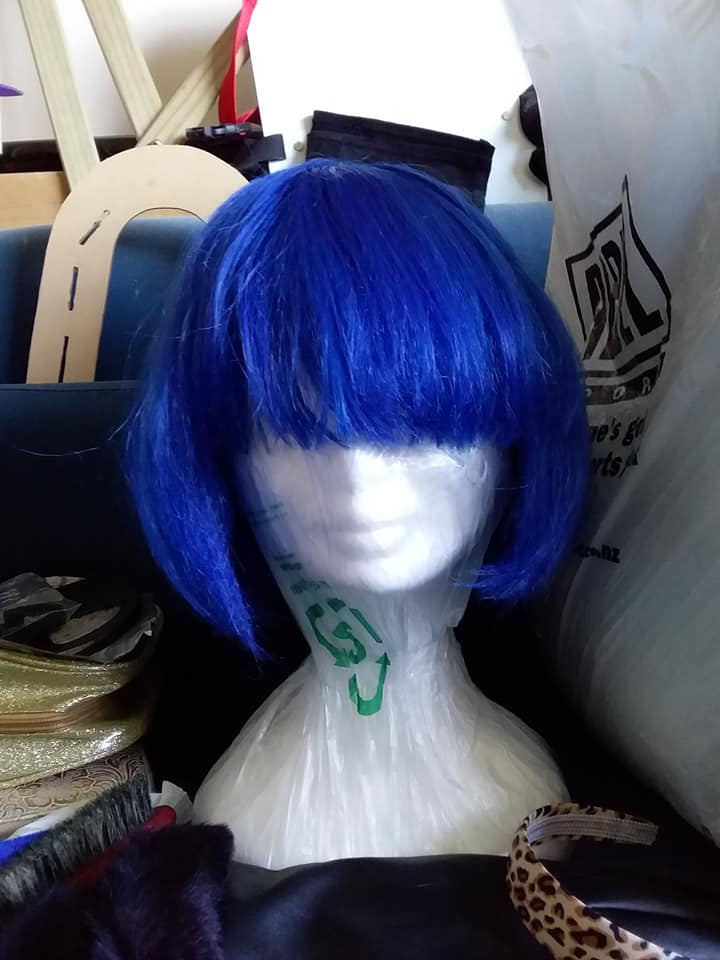 I started off by finding a bob style wig in the approximately right blue and ordered it online (I'll add the feather in later). However, like usually happens with buying online the colour of the actual product didn't match the image so it was time to get colouring.