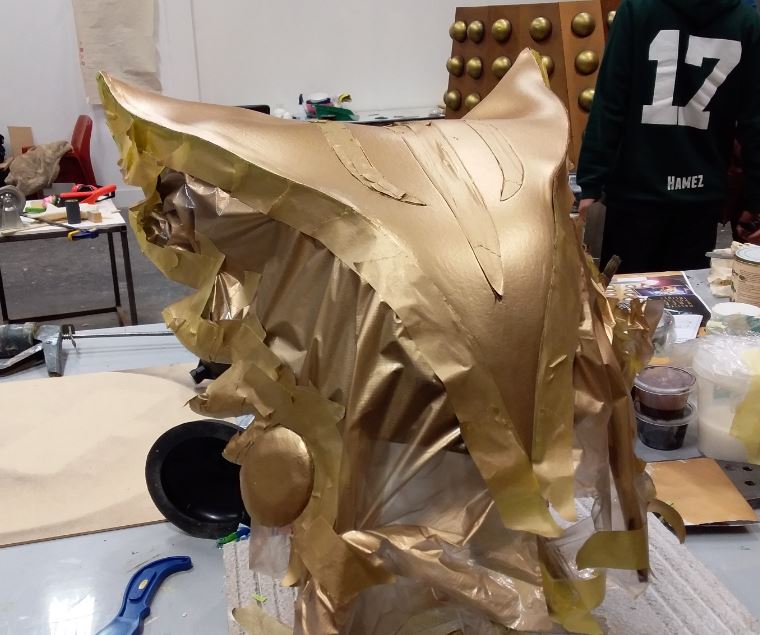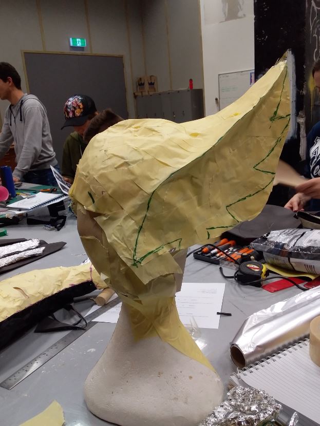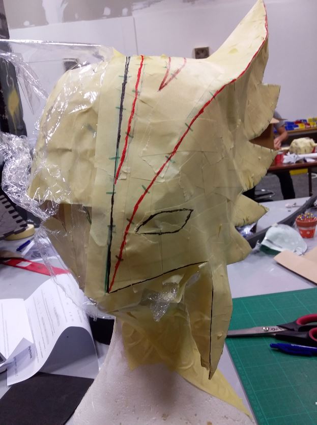 I wanted to make my own pattern from scratch rather than get one from the internet so to begin I got a friend to make a pattern of the top of my head by wrapping it in foil and covering it in masking tape. I placed this onto a foam head and using more foil and masking tape as well as brown paper I started building up a pattern.