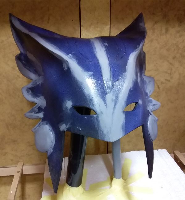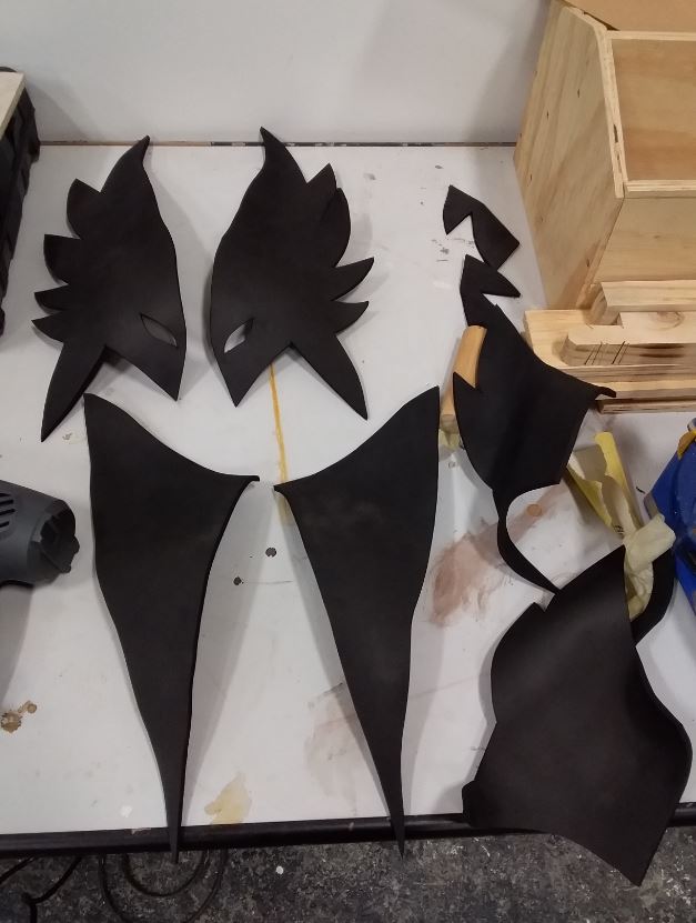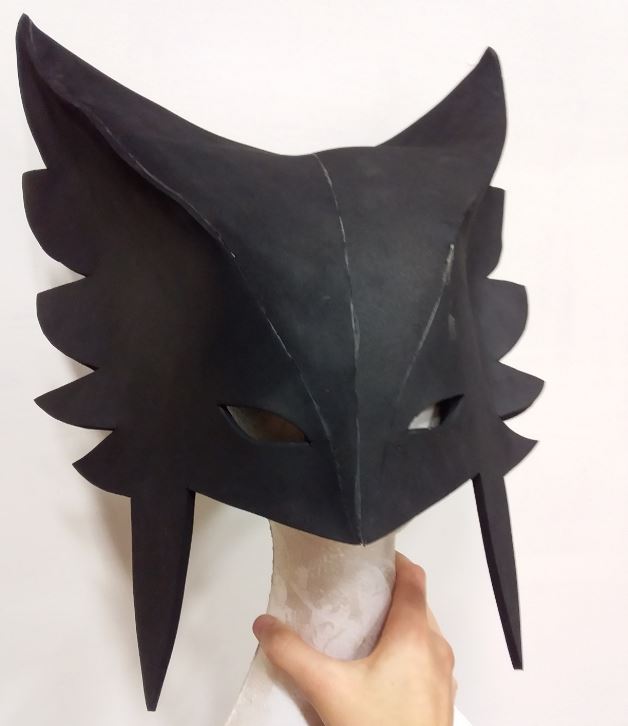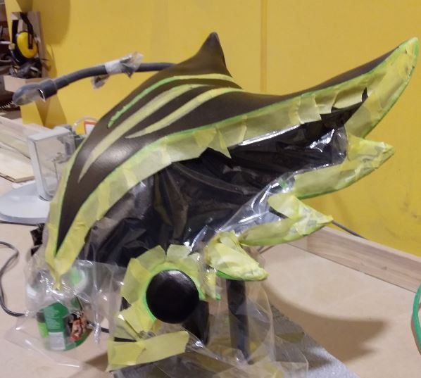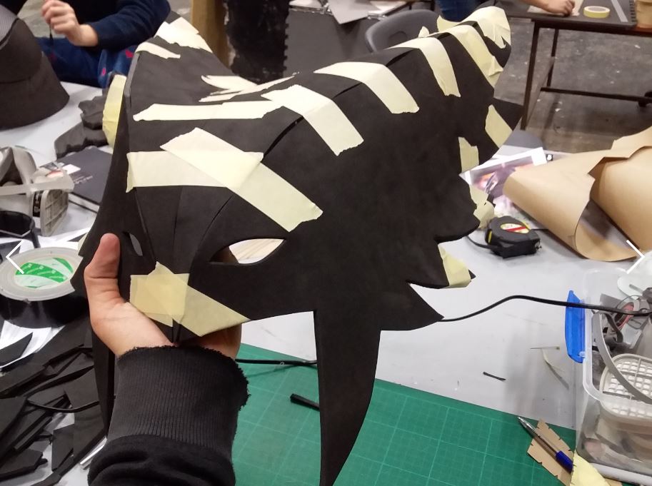 Something I did at this point was check all my pieces fitted together, and figure out which surfaces I want to glue together (e.g. for the 'feather spikes' on the side of the helmet I glued the two layers onto each other flat, but with the seams on front I glued the ends together). You can easily do this with some masking tape since this comes off easily without damaging the foam (there are even multiple levels of stickiness for masking tape if you are worried, but the standard tape didn't damage my foam at all).