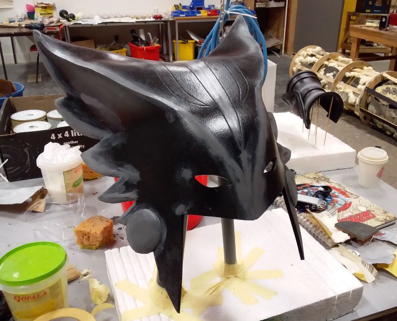 To begin the painting I got some black water-based paint, thinned it down to the consistency of melted ice cream, and used a spray gun to paint the whole helmet black. I focused the spray on the areas that needed to be black and kept doing layers till those areas were completely covered, but I didn't worry about covering the other areas.