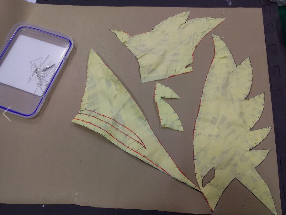 With all this drawn on I could finally cut the pattern into pieces after sliding my pattern off the built up shape (I did have to cut a slit), cutting small indents where the lines to connect the pieces are (this lets me draw in the lines easy since there's now a gap for my pen). What you can do at this point is trace the tape patterns onto some card to make neater and more durable patterns, but you don't have to (I personally did).