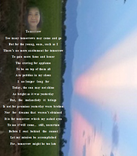 You’re right, my friend. Now, I know you’re still young. At my age, I’m so grateful every time I wake up to a new tomorrow. However, my focus is no longer for tomorrow but, today... to do everything I can do today, simply because I may no longer see “another tomorrow” tomorrow. Anyway, I have already woke up to 20,650 tomorows in the past. Once again, thank you so much, my good friend. You will be included in my next post. You’re giving me so much inspiration.