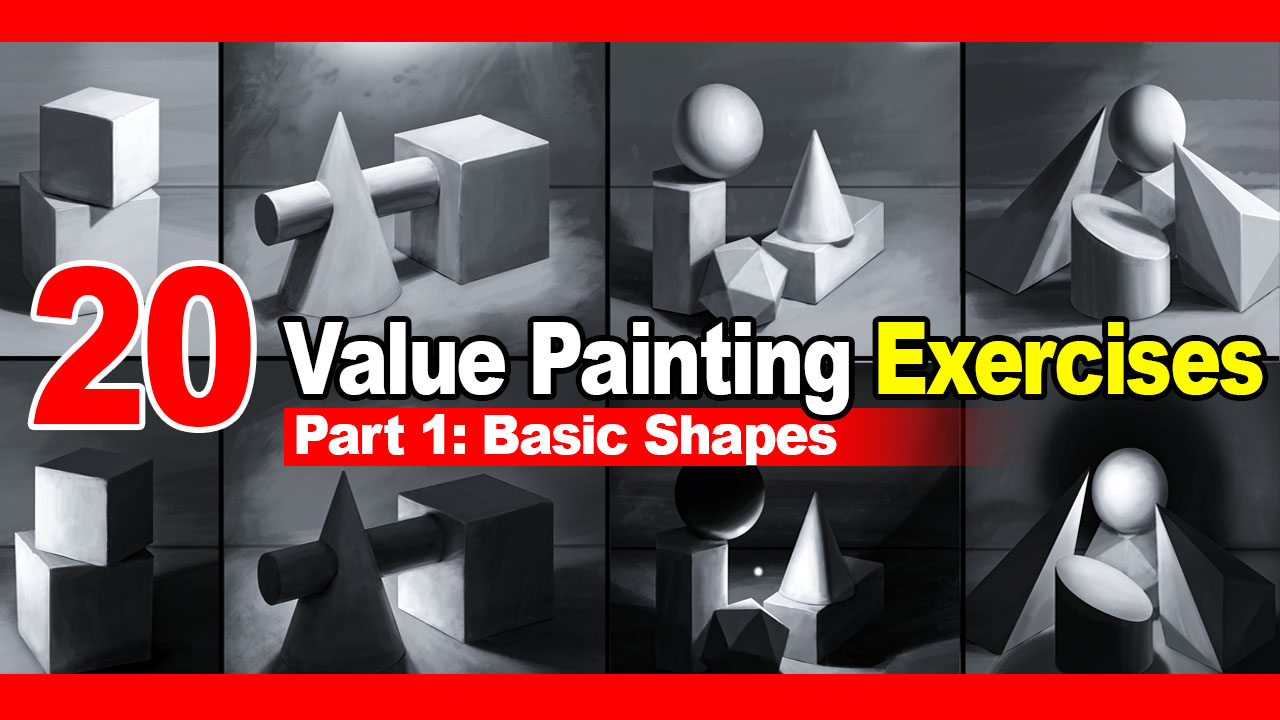 This is the first part of 5 parts of the exercise video for the 2nd lesson in the "Art Journey Series book 2". In this painting video I show 20 different examples for 5 different basic shape sets. I use different basic shapes, different light types, position, direction, intensity and even different basic values for the objects themselves.