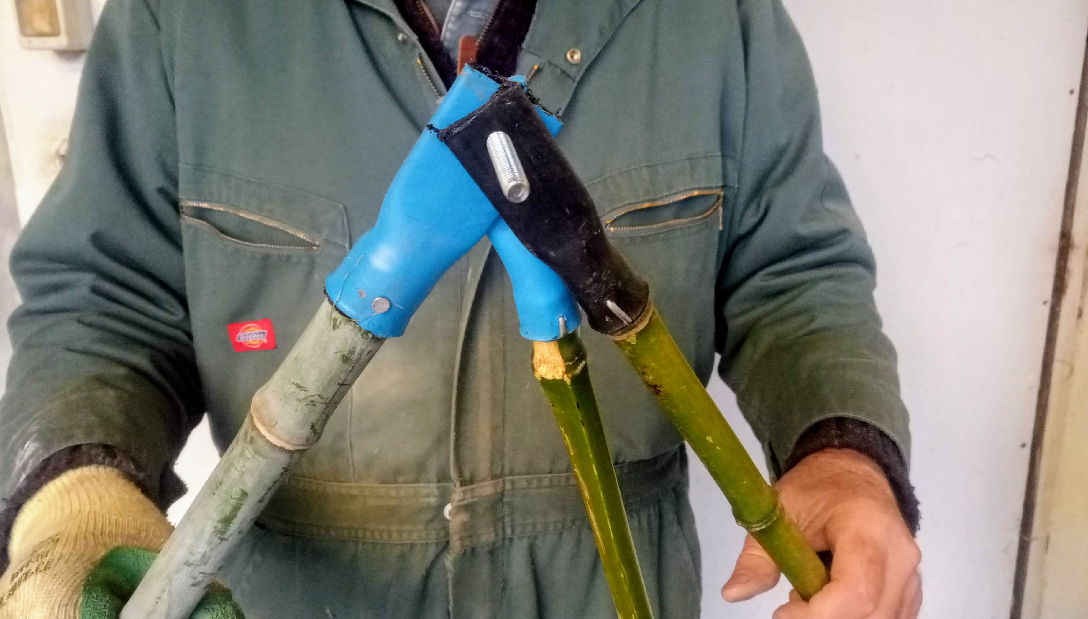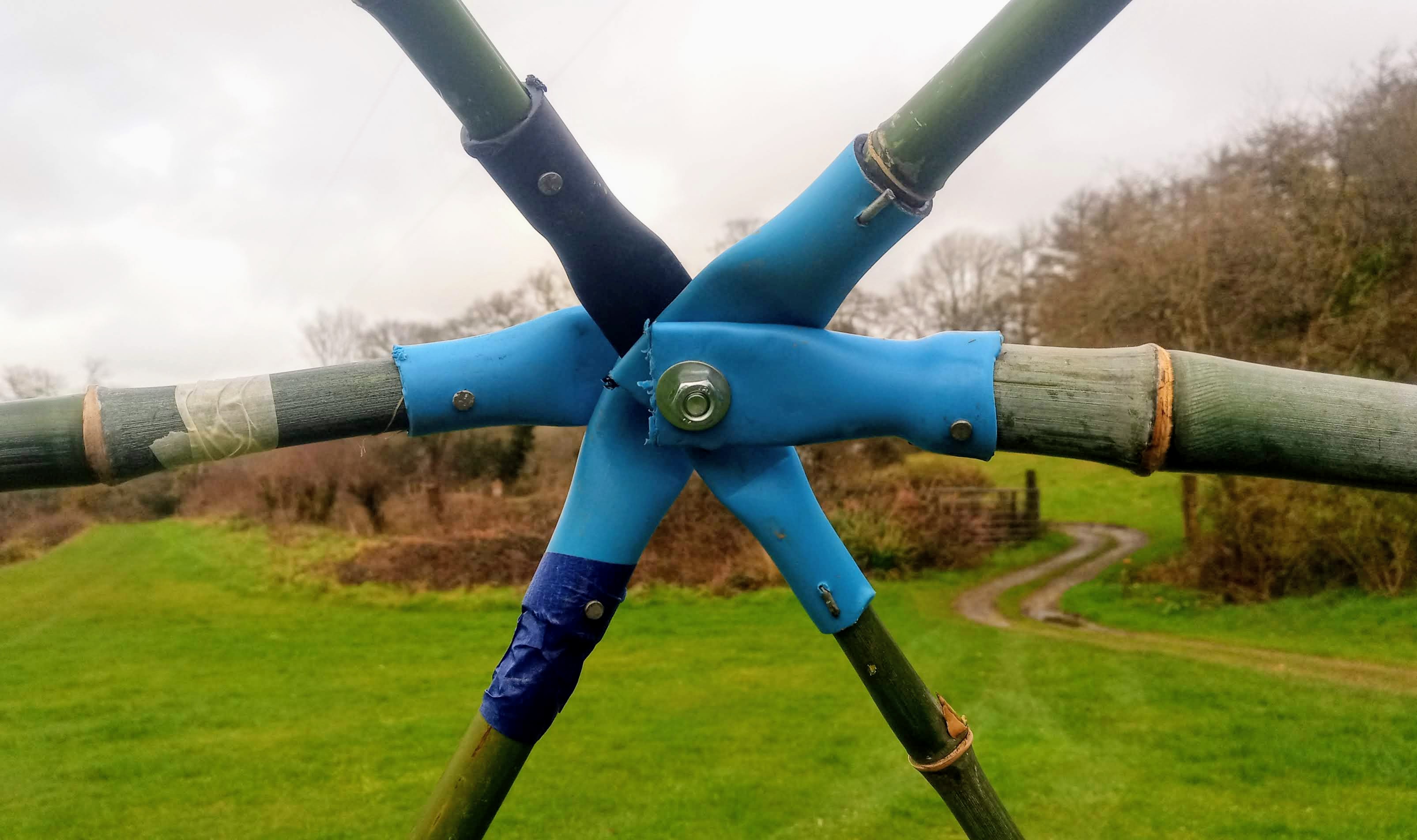 It meant that we needed 35 long poles and 30 shorter poles to form the two triangles. - To connect the bamboo to the node we used two size HDPE plastic pipes, measuring 2.5cm and the other 2cm