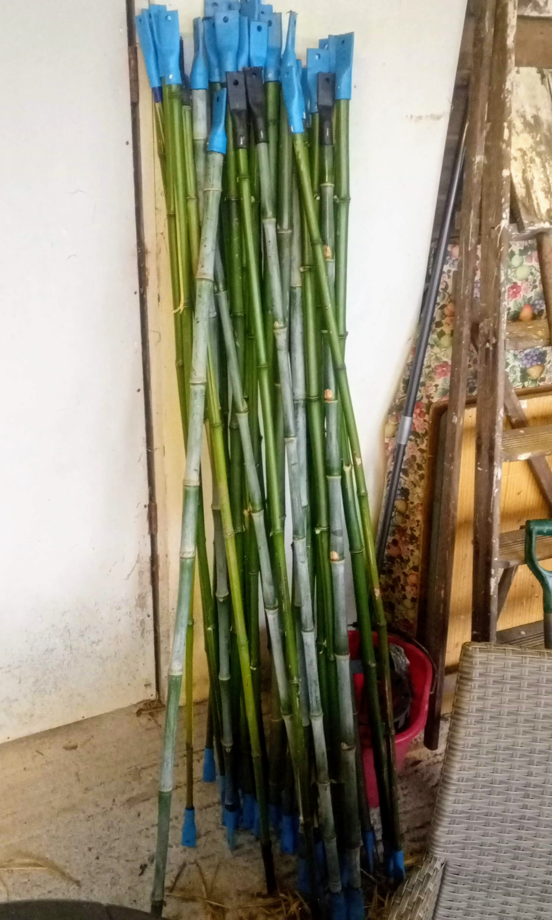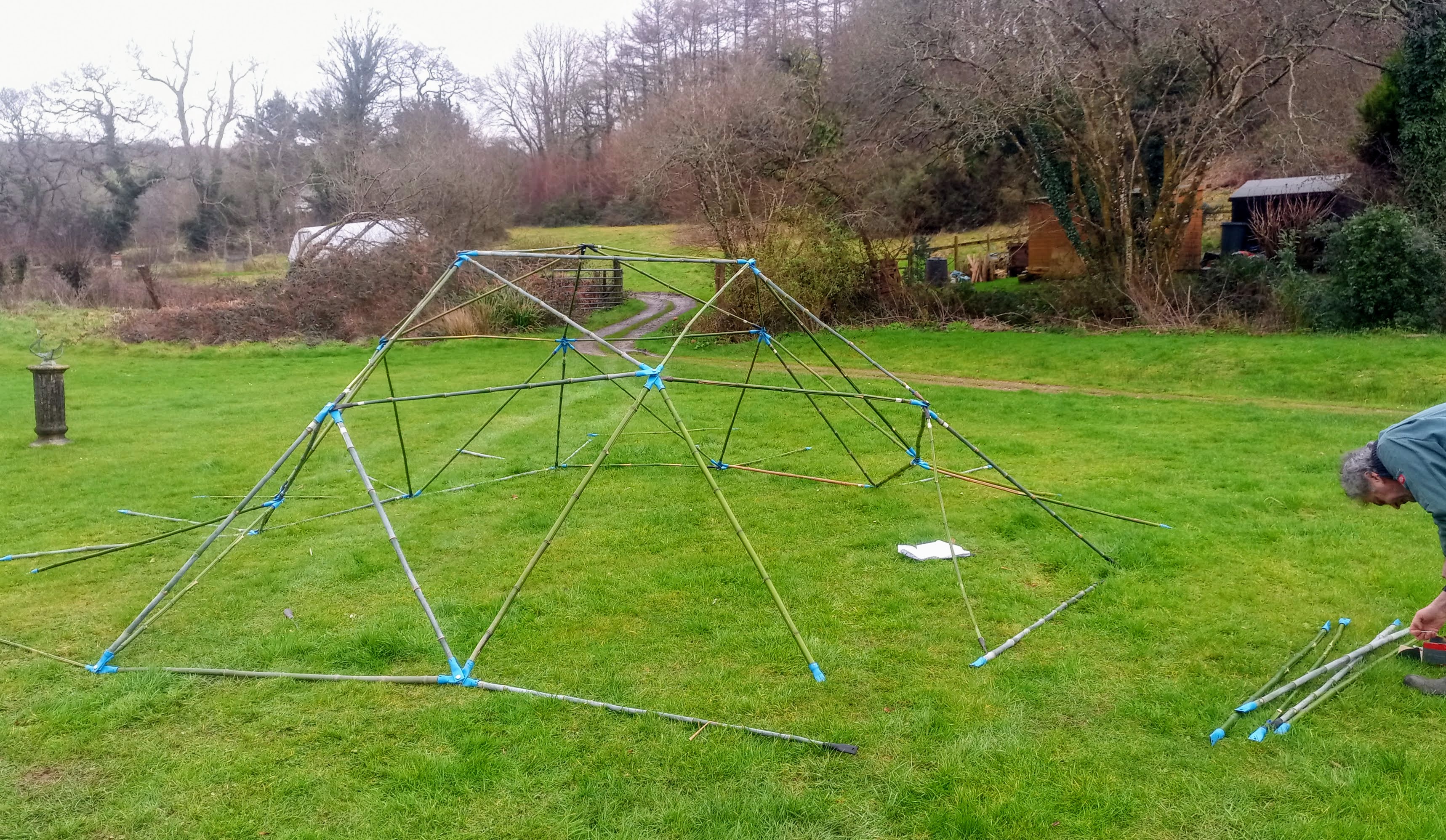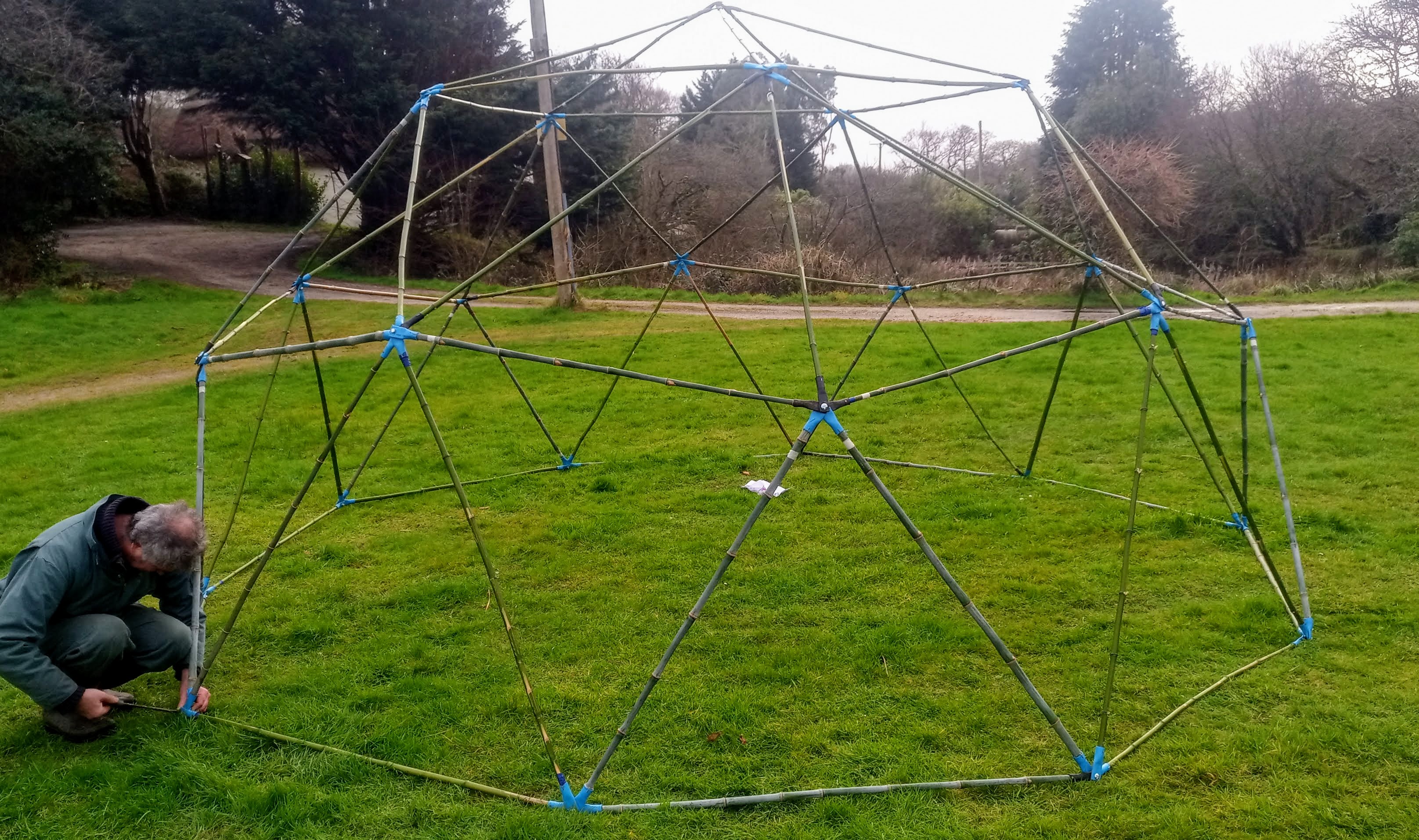 Last week, we (Becky's dad and I) started on the bamboo geodesic project. It was a thought that kept being bounced about the house until the neighbor needed his bamboo hedge cut back. The aim of this project was partly inspired by Dave Hakkesn, from onearmy.earth, who up-cycles plastics and re-purposes waste.