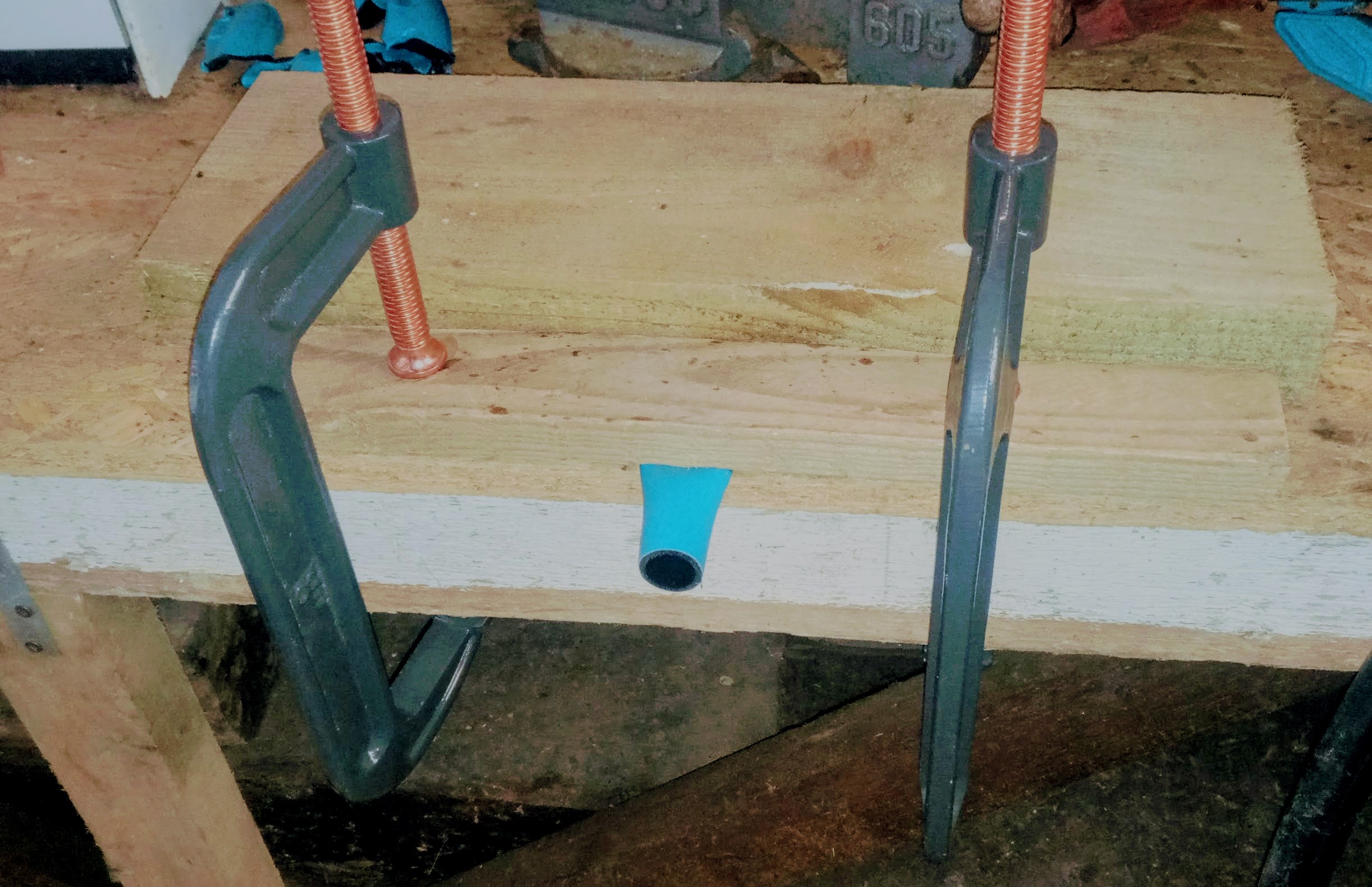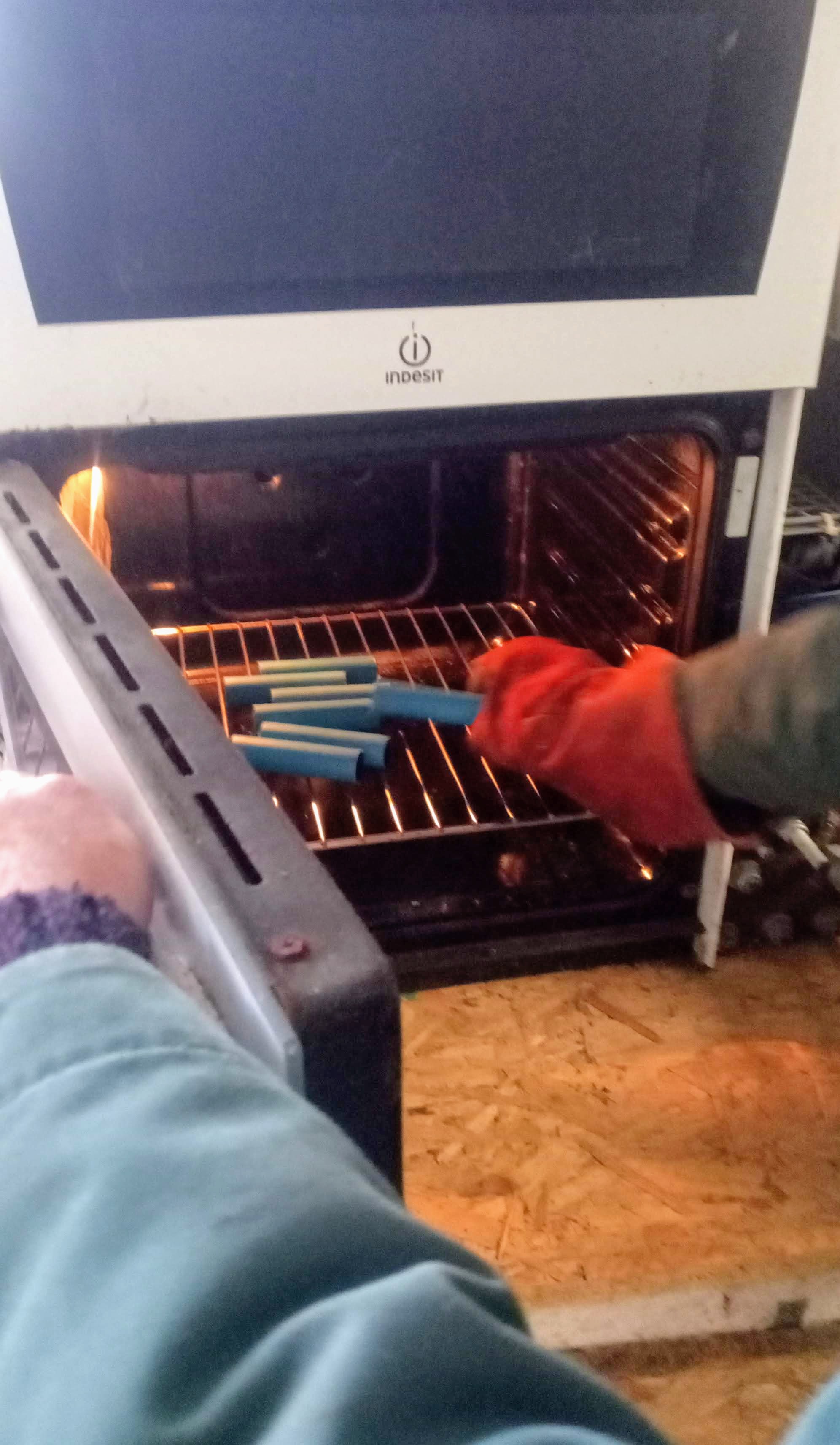 Making roughly 80 odd 10cm long blue bits (there where some accidents on the way). Backing them in a standard kitchen oven for 10 minutes at 100 degrees C. Molding 5cm under D-clamps until they cooled down retaining the new shape. We found that we could effectively mold four blue bits at a time and any longer than 10 minutes would result in some contemporary art installation... some post-modernism Salvador Dali look alike 😂