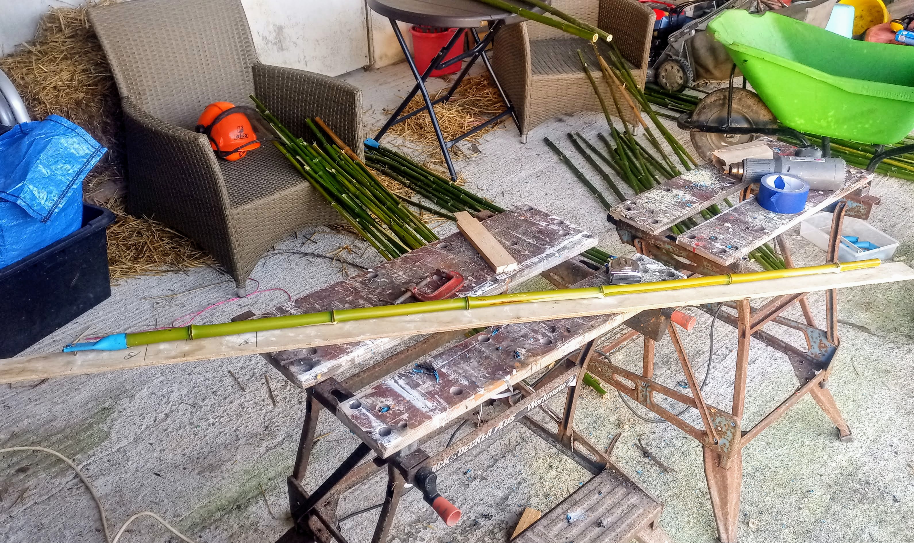 Nailing the plastic over the bamboo as bottom images shows cutting the ends of and hammering them flat - Before assembling the structure we tape-coded the small polls to easily distinguish them from the longer ones