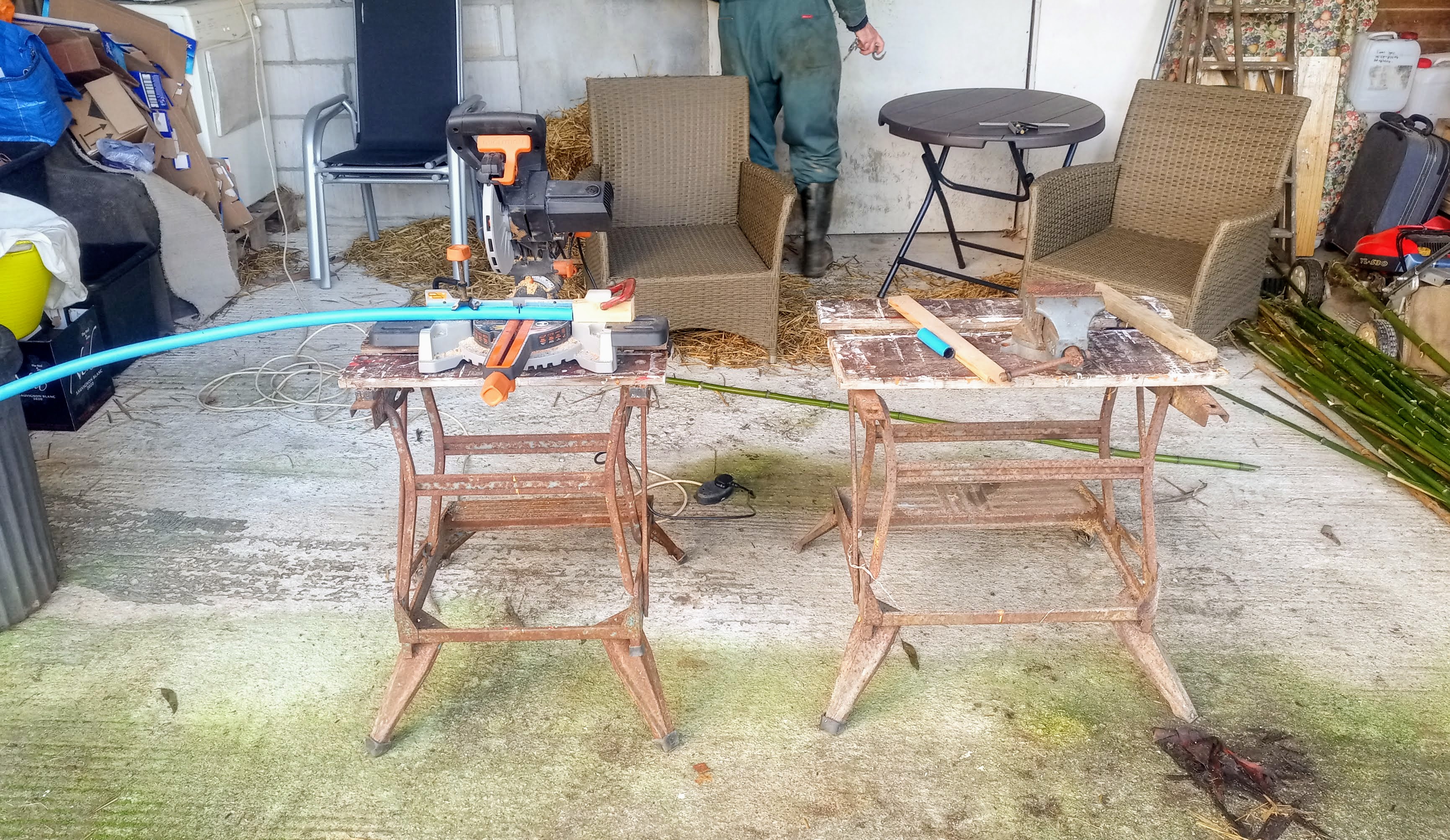 After a bit of head-scratching and research we found an easy way to fit the bamboos onto the frame. Around the barn there where several meters of HDPE 2.5cm and 2cm pipes. We used these two sizes to adjust around the various bamboo dimensions.