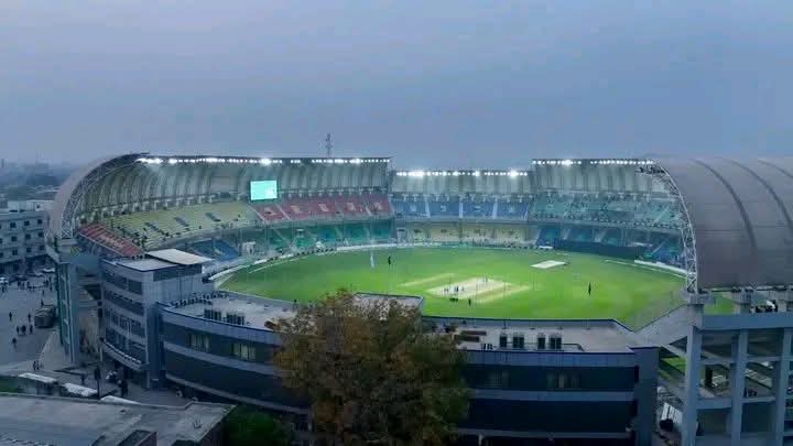 The ground features colorful seating areas, a well-maintained pitch, and a large curved roof structure that provides shade for spectators. This modern stadium is expected to host major domestic tournaments and international matches, bringing the excitement of cricket back to the people of Peshawar and across Pakistan. 🏏✨
