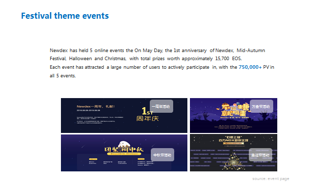 Newdex ha realizado 5 eventos online el On May Day, el primer aniversario de Newdex, El Festival de Medio-Otoño, Halloween y Navidad, con un total de premios valorados aproximadamente en 15,700 EOS.