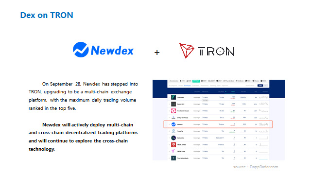 El 28 de septiembre, Newdex entra en TRON, actualizando para ser una plataforma de exchange multi-cadena, con el volumen de operaciones diarias máximas calificadas en el top 5
