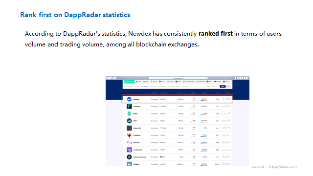 De acuerdo con las estadísticas de DappRadar, Newdex ha consistentemente clasificado primero en términos de volumen de usuarios y operaciones, entre todos los exchanges de la blockchain.