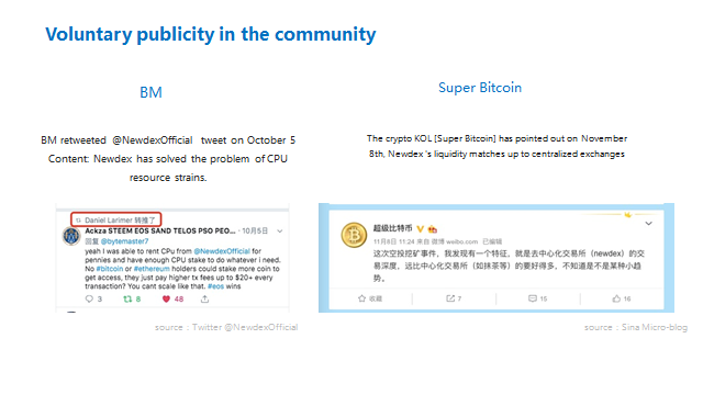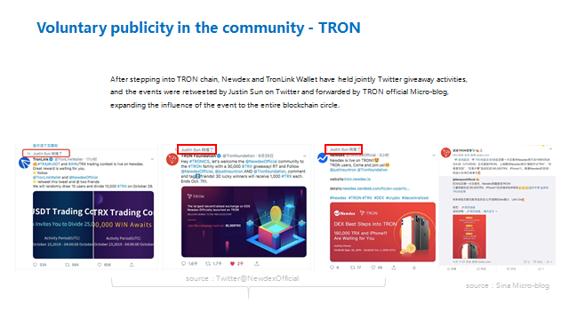 Luego de entrar en la cadena TRON, Newdex y la Wallet TronLink han organizado en conjunto actividades de regalo en Twitter, y los eventos fueron retwitteados por Juntin Sun en Twitter y reenviado por el Micro-Blog oficial de TRON, expandiendo la influencia del evento al circulo entero de la blockchain