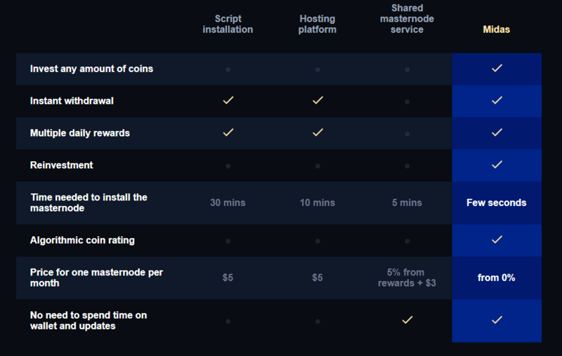 Empezando como un proveedor de servicios de MasterNode, hoy en día se ha vuelto una de las más famosas y en mi opinión personal, la mejor, toman en cuenta a los inversores con bajo capital y a los grandes inversores, sin mínimo de depósitos, con comisiones bajas y hasta con el programa "Zero fees". Adjunto una imagen de los beneficios que presenta la plataforma MIDAS en comparación a la competencia.