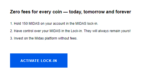El programa "Zero fees" tiene como objetivo anular completamente, los fees que tiene la plataforma, para esto. Se tiene que realizar un depósito de 150 MIDAS ( a la dirección que ellos te presenten, estos quedarán de forma "bloqueada" mientras que el programa este activo, pero en cualquier momento se podrá cancelar o retirar, si así se desea.
