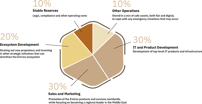 All the funds raised through the EMRX token offering campaign are to be used solely for development of the Emirex Group. Funds will be used in the following proportions: