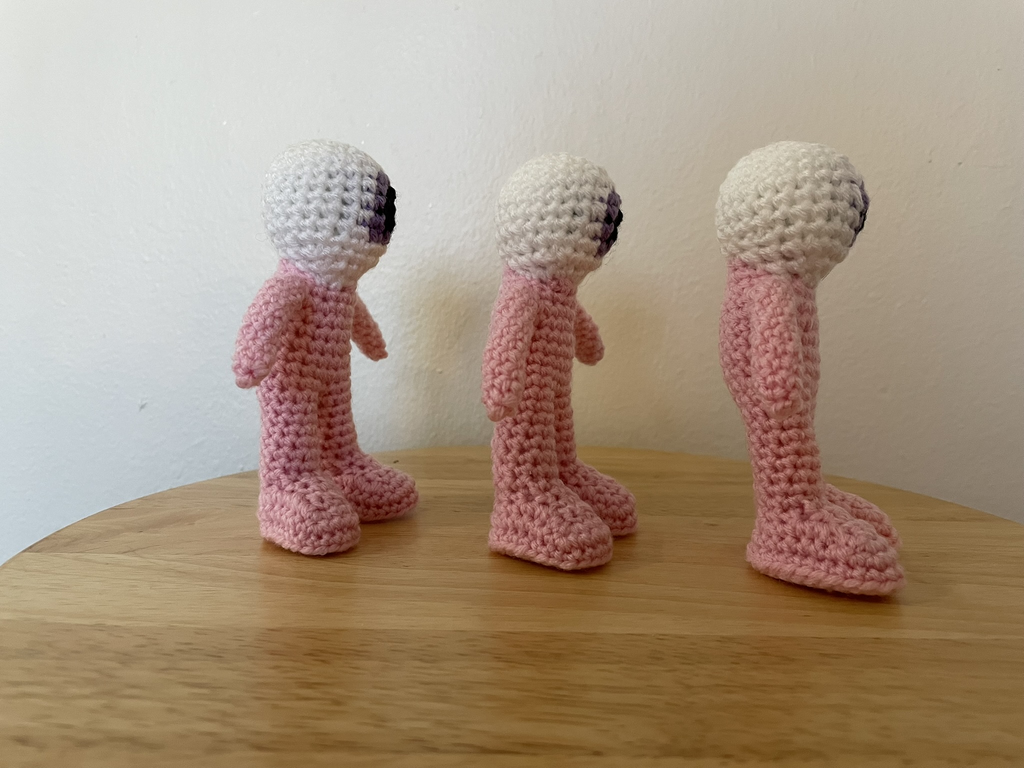 I was also experimenting with the head/body transition with each version, and I think each one I did was better than the last. I'd probably be good if I used this for whatever one I do next, but there are also a few more experiments I want to do with the back of the neck. (Although I'm also contemplating giving myself a short break from my own patterns by trying one or two that I have from a library book I checked out.)