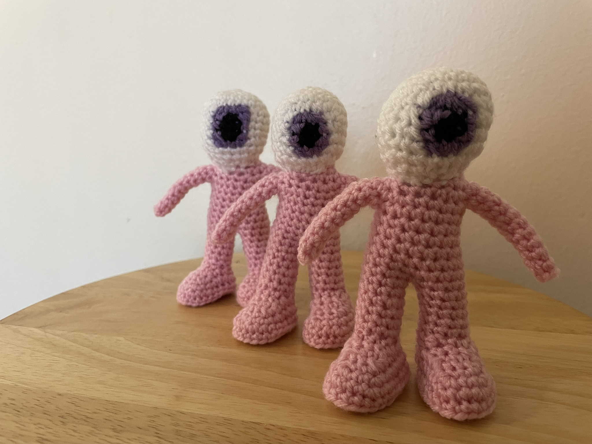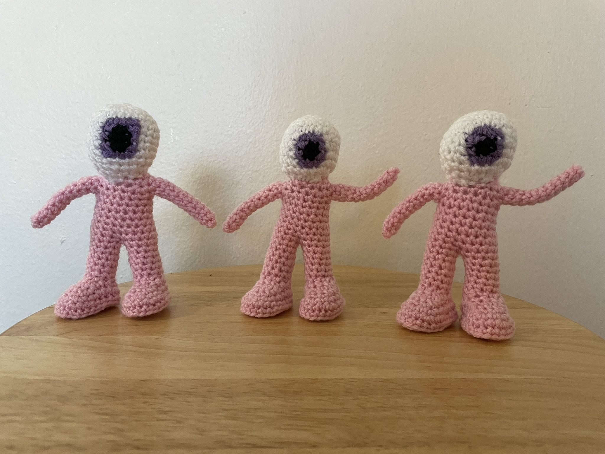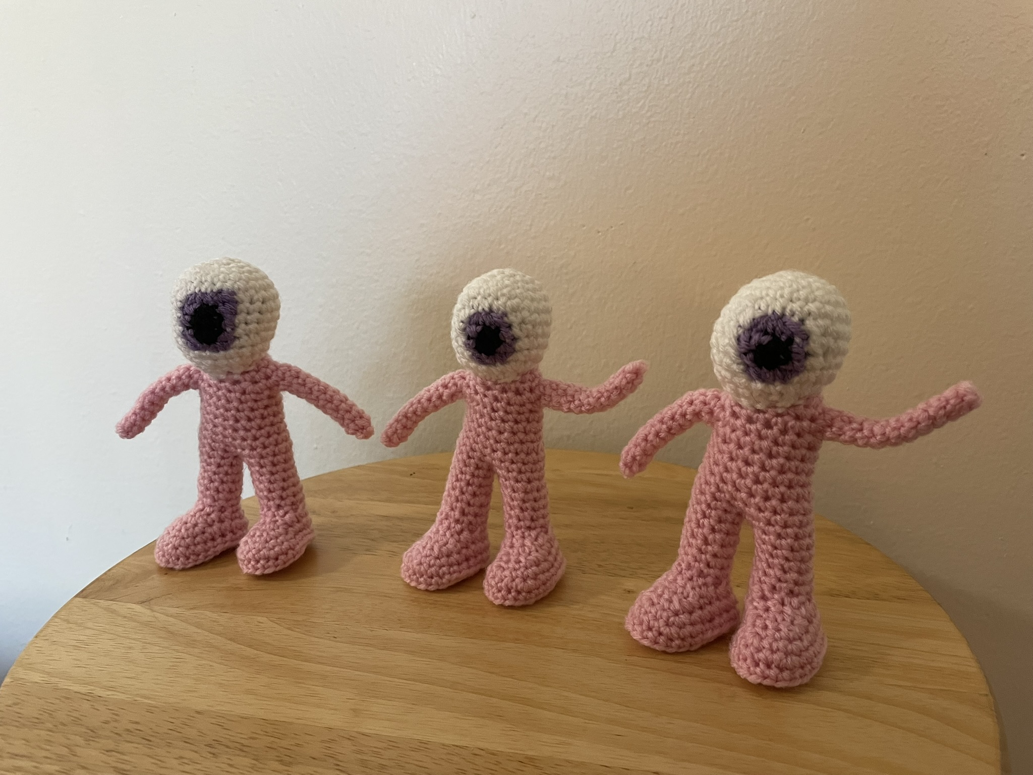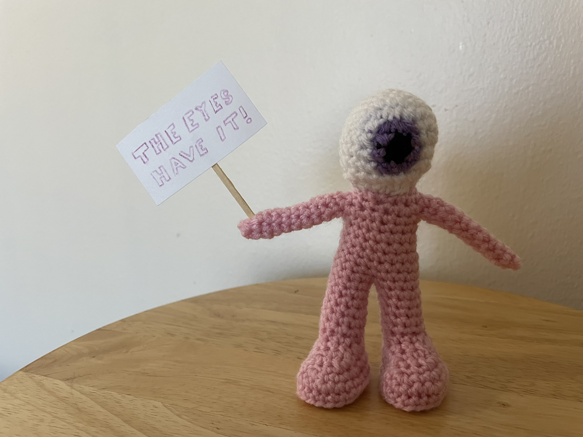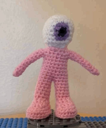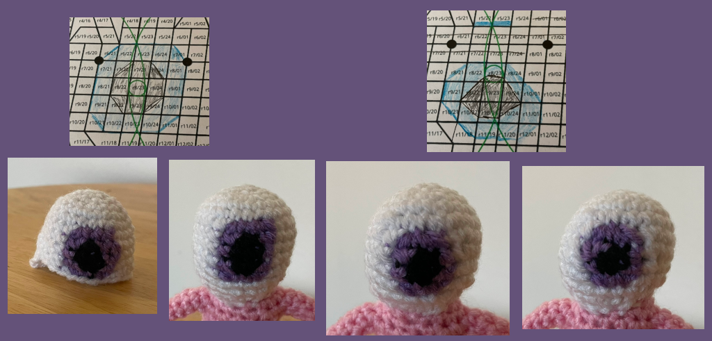 First I started with a proof-of-concept using up the last of a skein of white yarn and using the "you don't need to worry about diagonals going down" idea I worked out before the Candyman Kane project. That looked OK, but I felt I would have better symmetry if I included my "diagonal" technique on both sides anyway. Because of the slightly-angled grid effect of the amigurumi spiral method I felt like I was getting too sharp of a squarish-looking corner on the upper right and lower left with my full-octagon pupil-and-iris pattern. Plus I remembered that my humanoid pattern's head isn't a sphere but slightly oval, so for the next try I skipped two rounds of the pattern to make the head rounder, and used a pattern that was more likely to get a consistent thickness of iris around the pupil. I thought this one was pretty good! The only downside is that there is a little show-through, with a bit of black showing through the purple iris on the left side and a bit of white on the right. So I decided to try the other technique from the first video to see if that would help. It really twisted my head to try to map what she was doing to how I do stitches, so I'm not sure if I was doing it right. I don't think the final results were better, so either I was doing it wrong, employing it in the wrong place, or the technique doesn't address the problem I was trying to solve. So that technique was a bit of a bust, but the "different-color top loop" one is working great, so a big thanks to @flowertron for sharing that with me.