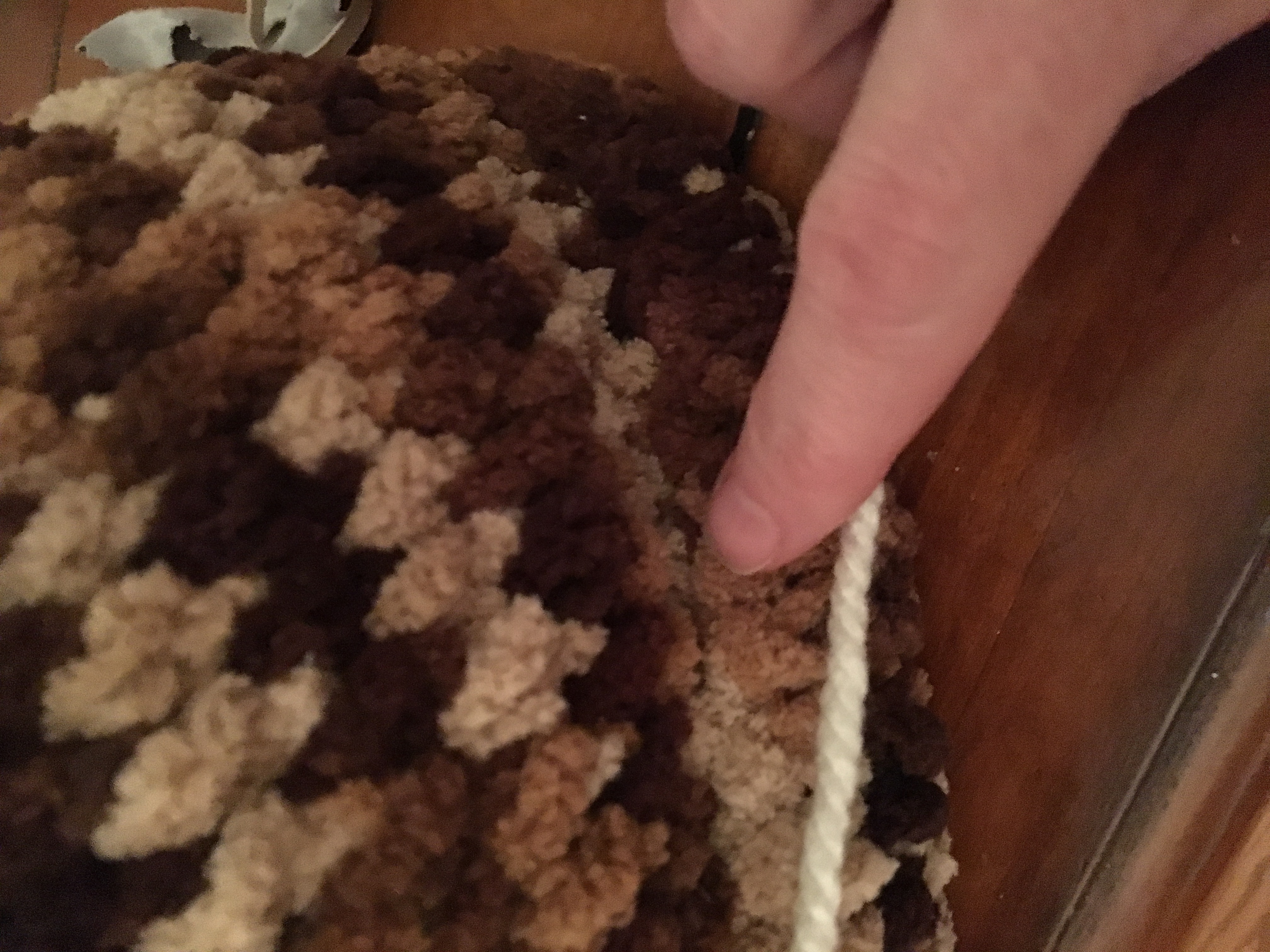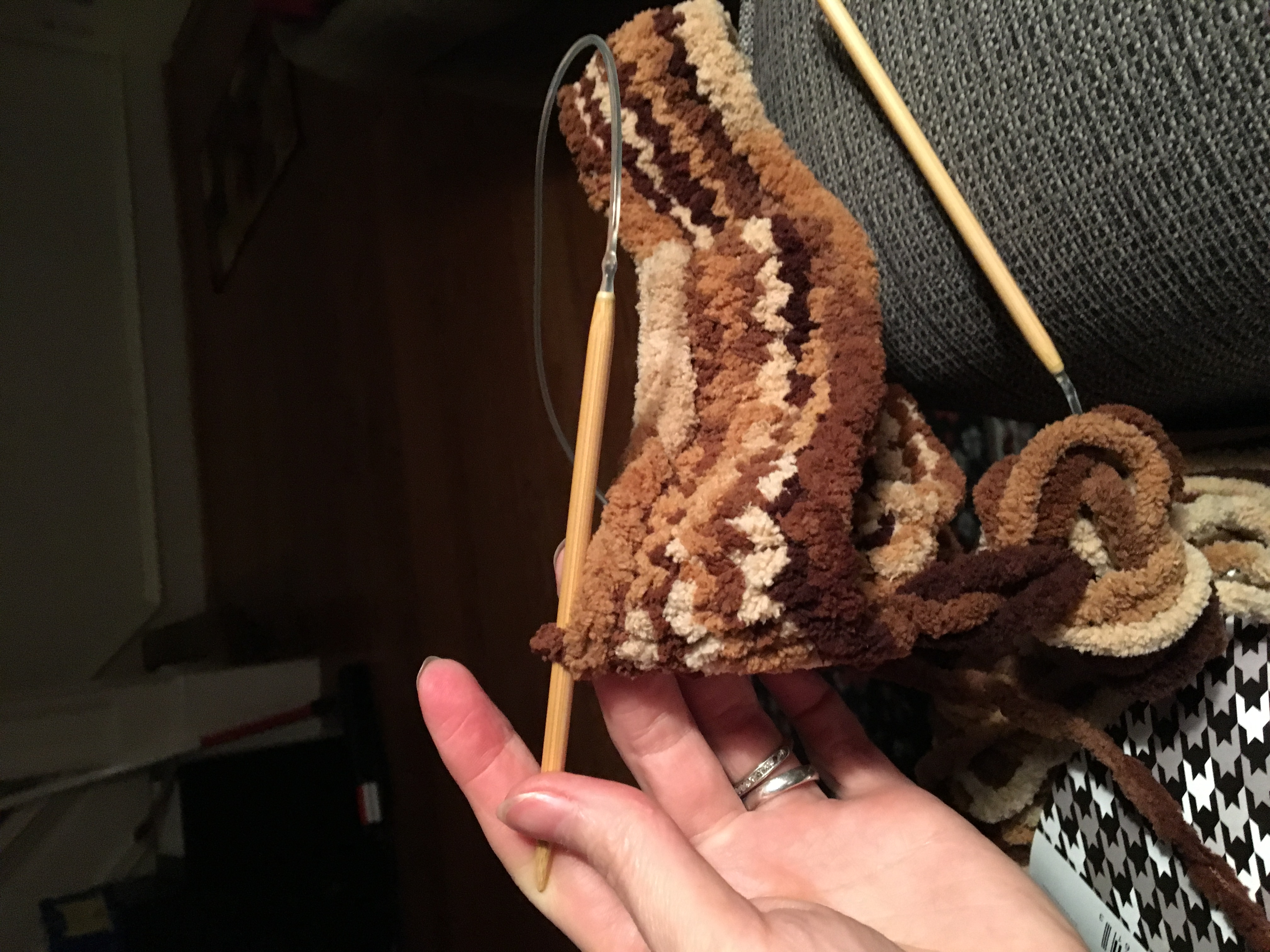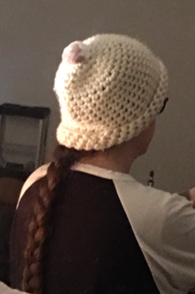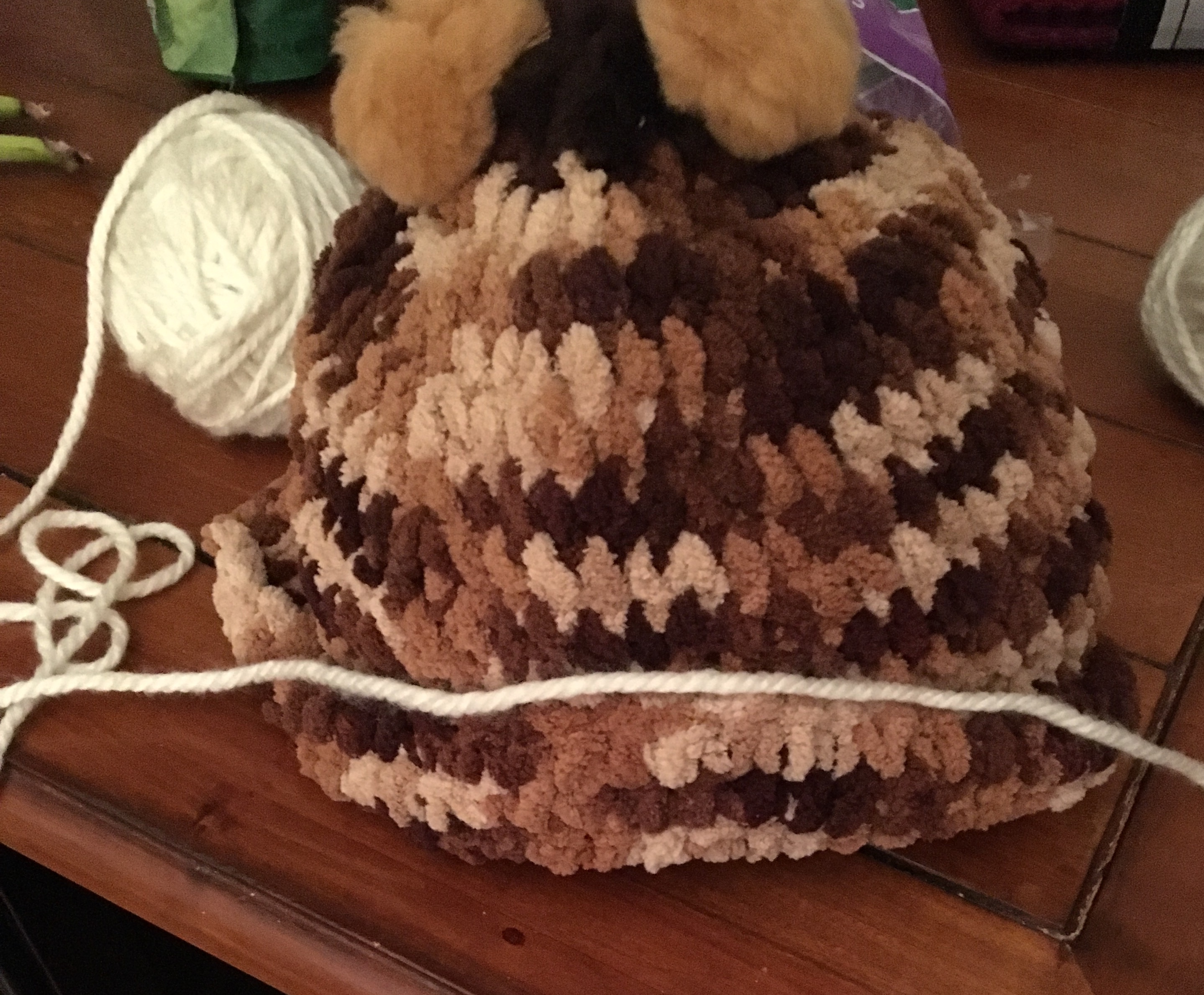 I’m being lazy about learning to dcrease knit and wasn’t working in the round anyway, so I frogged it and crocheted an easy hat. This chenille yarn is super tight so it’s warm like the knit. Then I made it super cute with pompoms.