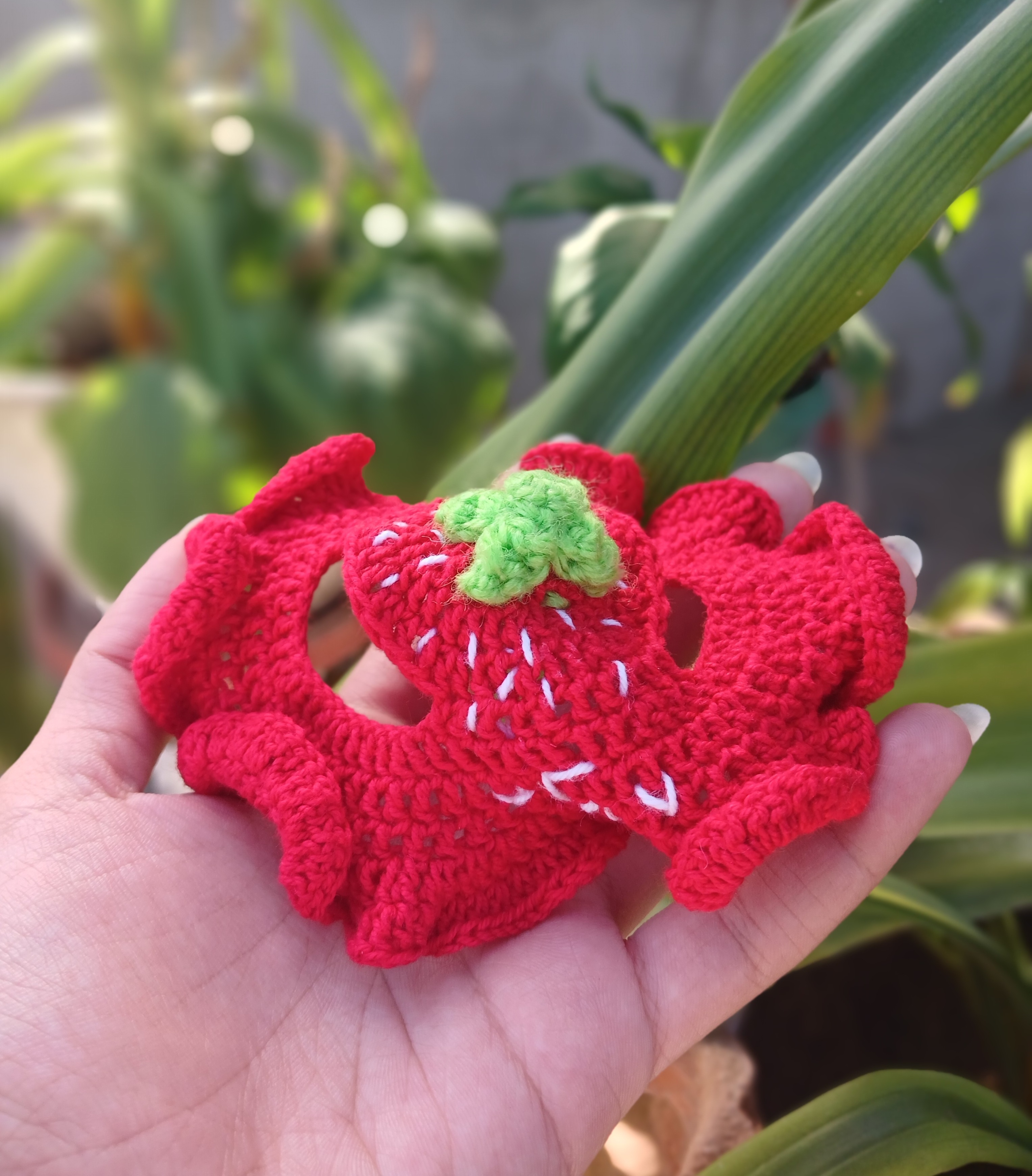 Aprovechando que el hilo era rojo, le hice unos detallitos para que pareciese una fresa, para el tallo utilicé lana verde y para las semillas hilo de algodón blanco, además intenté hacer una G, pues es la inicial de la gatita (Gregory)