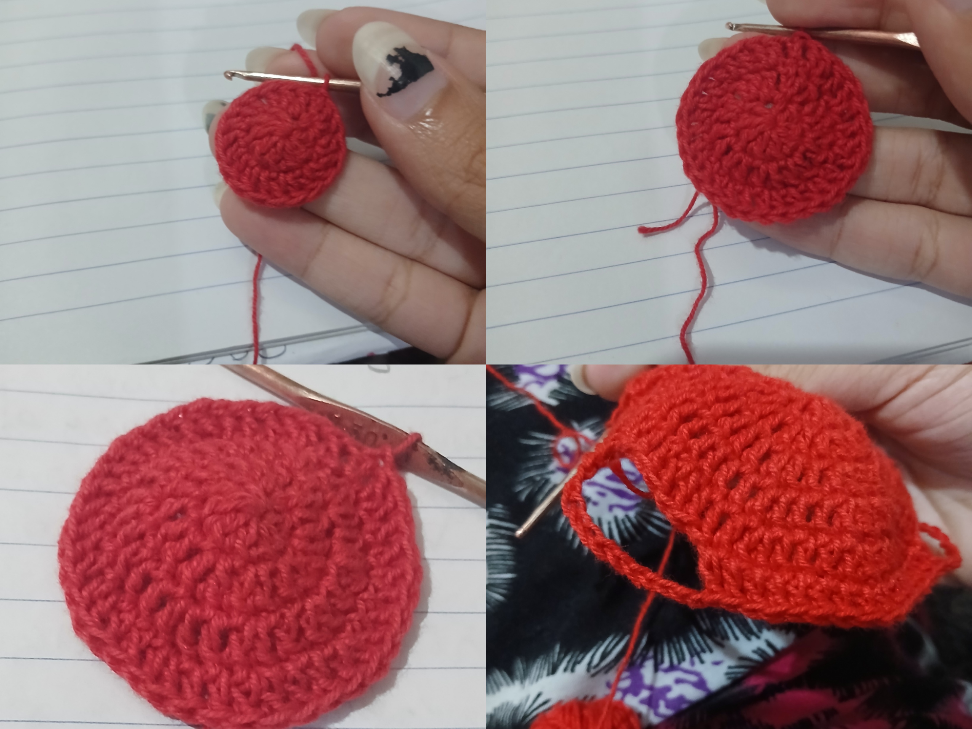 R6: Al iniciar la vuelta, hice 5sc, luego hice el espacio para las orejas, después 15sc aprox y al hacer el otro espacio seguí tejiendo con normalidad sin aumento