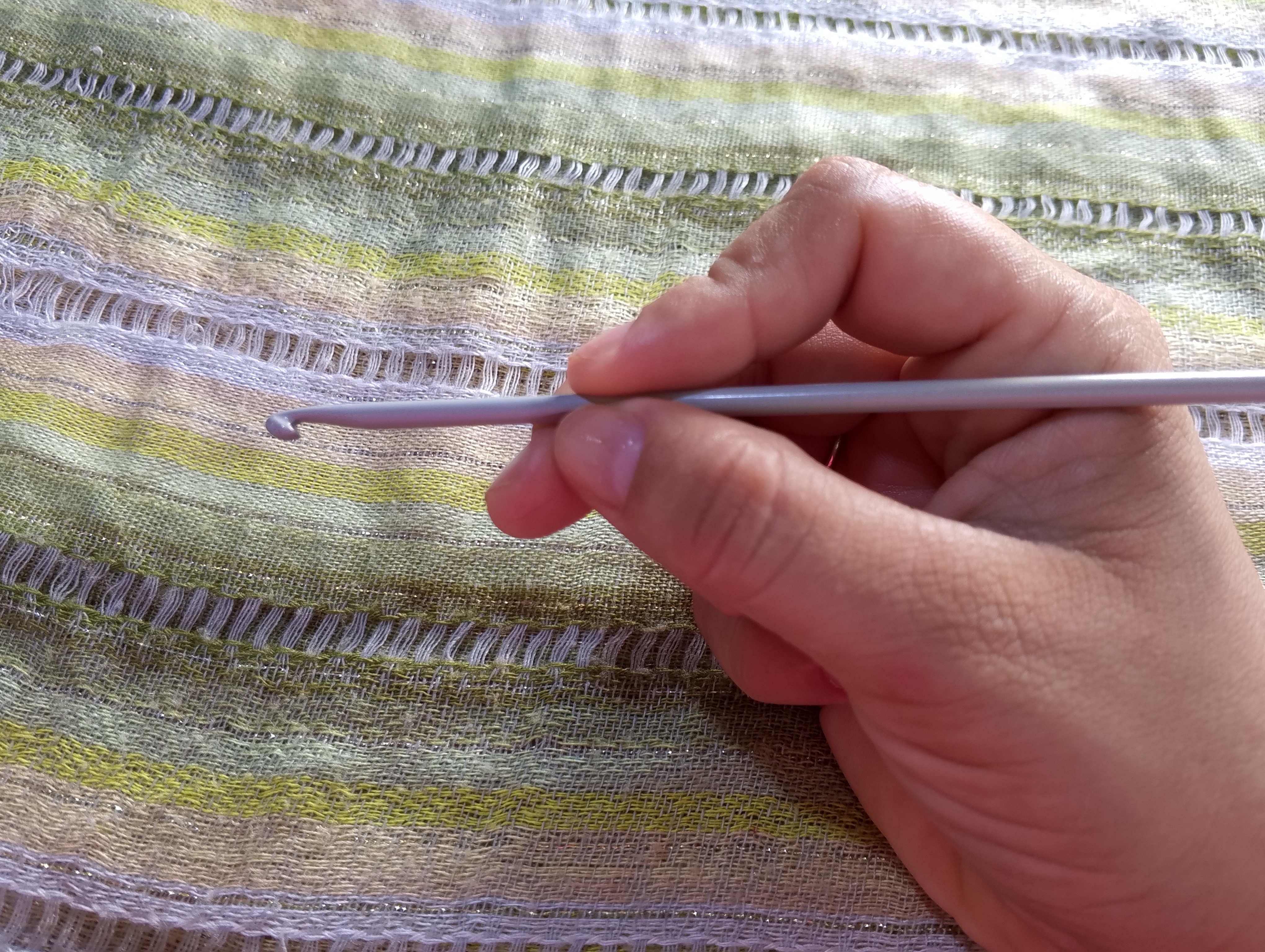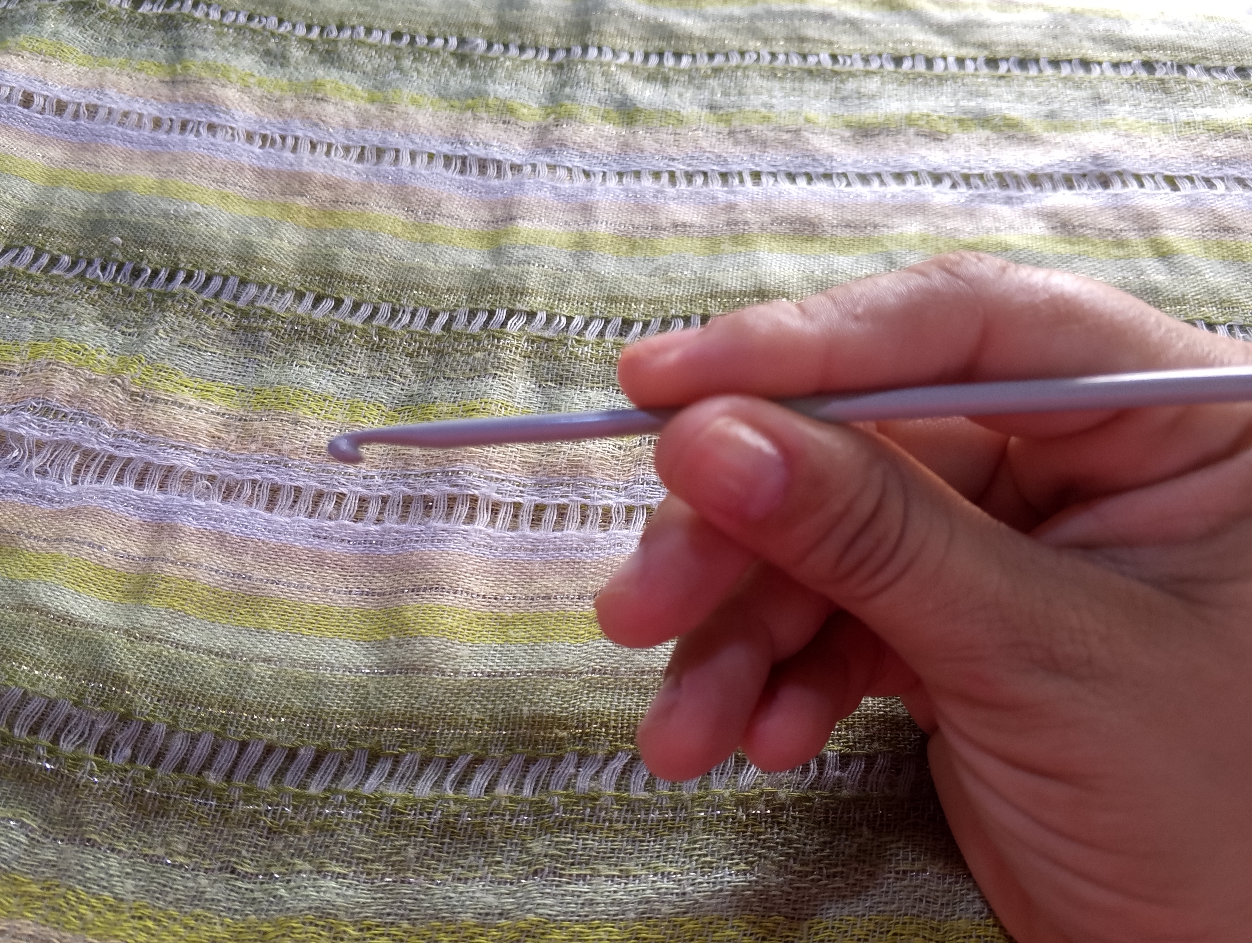 Lo que vamos tejiendo o la labor, lo podemos sujetar con los dedos medio y pulgar de la mano no dominante.