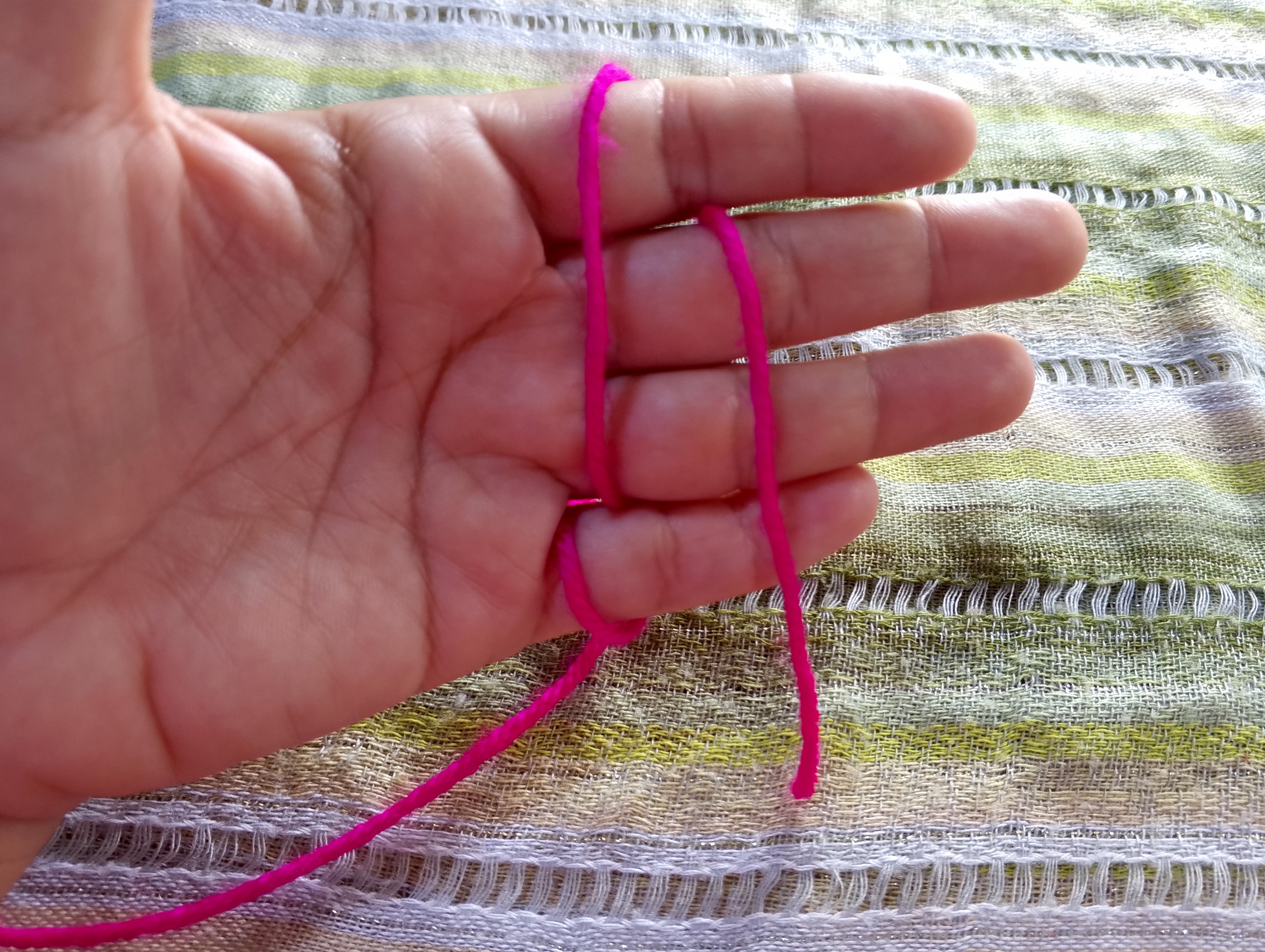 Otra forma consiste en dar una vuelta por delante al dedo meñique, se enrrolla y cuando esté por delante nuevamente se sube hasta el dedo indice y se pasa por detrás de este, de este modo se tienen dos puntos de apoyo para ir deslizando el hilo.