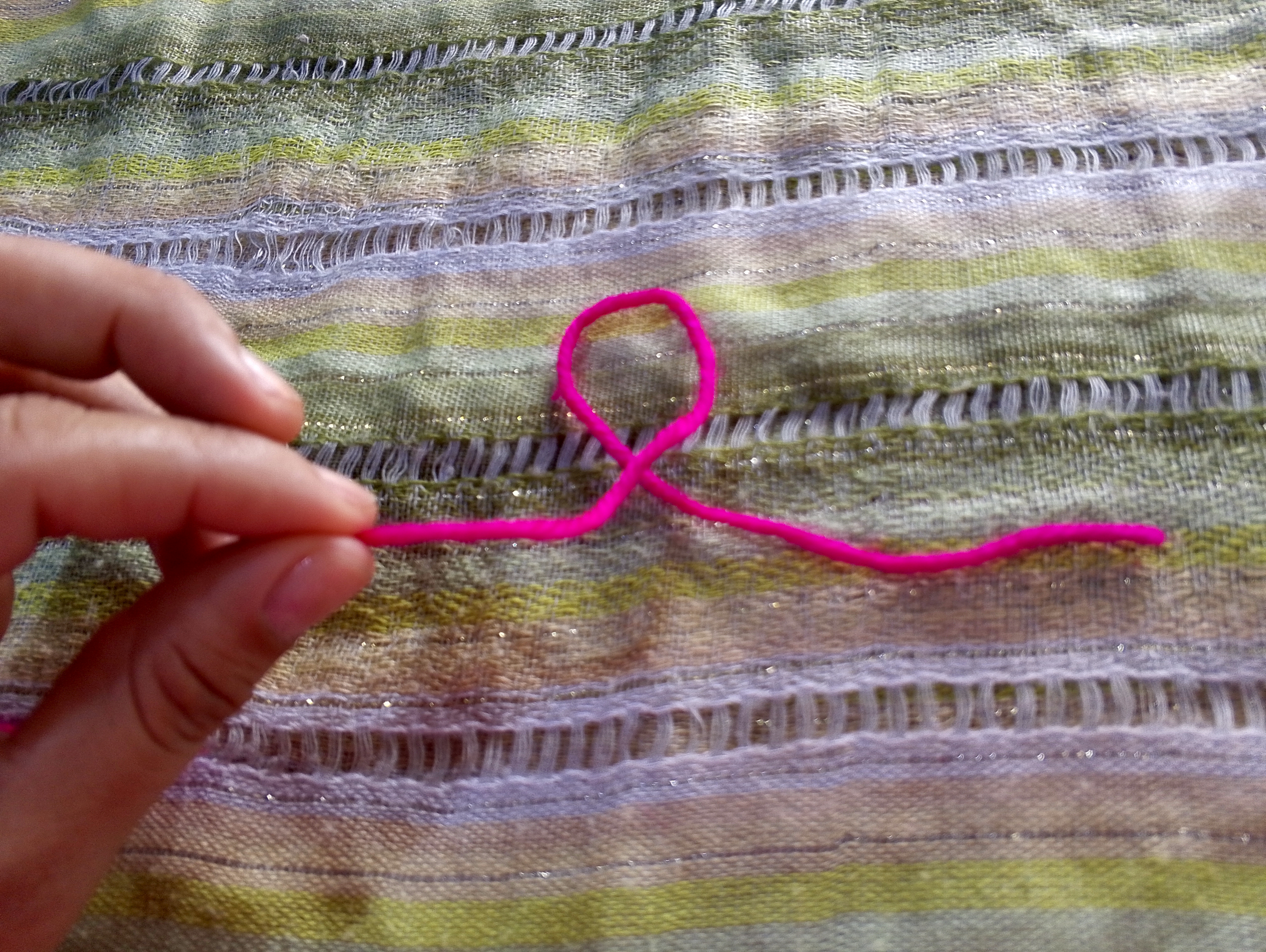 Realizamos la forma de una "e" pasando el hilo izquierdo sobre el derecho, quedando de esta forma.