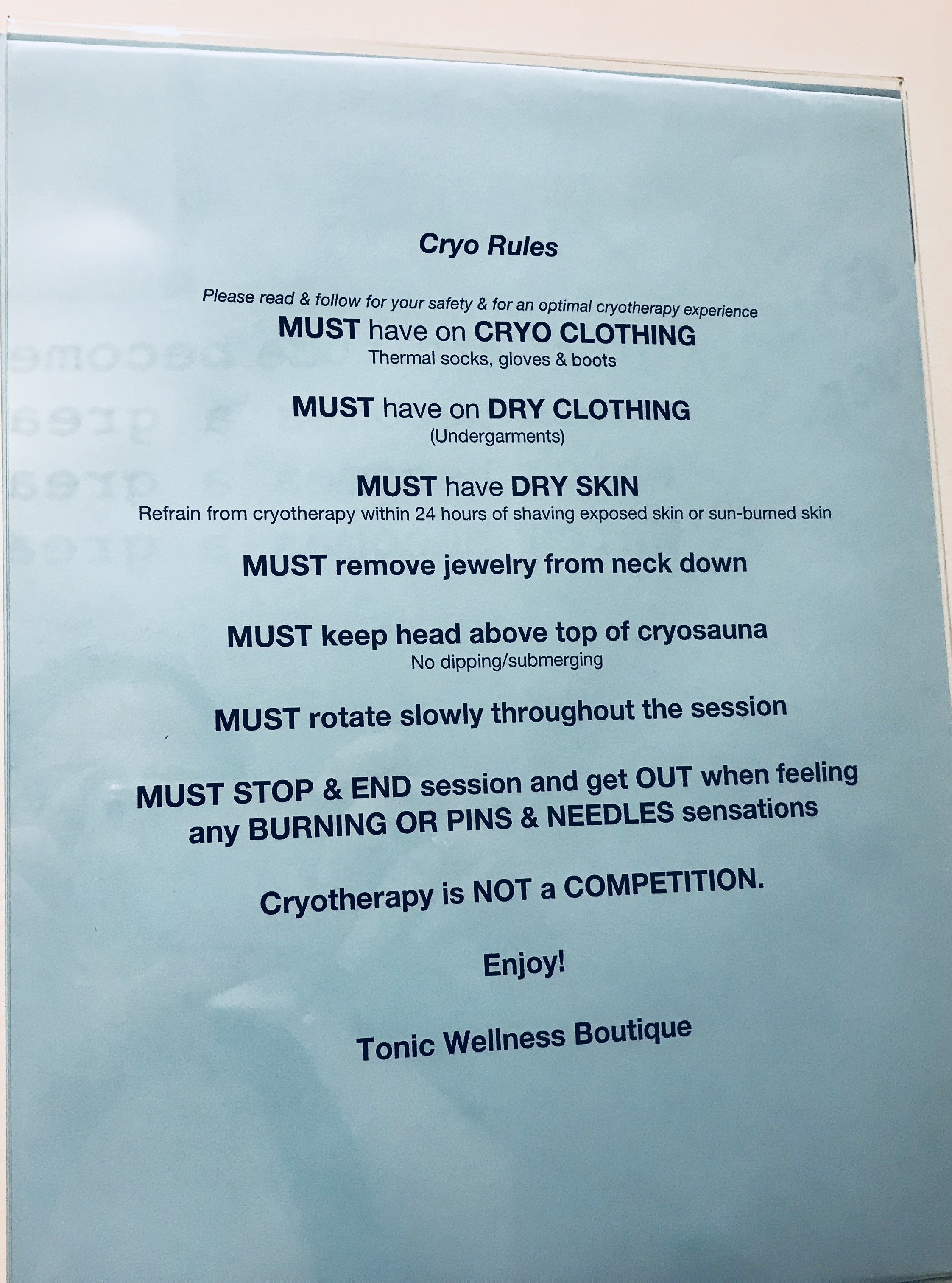 But then, magically, it ends before you even realize it. The attendant is there the whole time, so there's no need to panic. And...I have to say that I found the experience absolutely invigorating. I'd been dealing with a sore shoulder and it pretty much evaporated into thin air after I did cryo. Supposedly, lots of athletes use cryo for recovery. It's also credited with warding off depression, dementia, insomnia and several other conditions. Tony Robbins is rumored to have his own personal cryo tank in his home. And I can see why. After I exited in my robe, I suddenly felt euphoric. My surface body temp, which hovered around 90 degrees when I climbed in there, was now at 68. And I basically floated outside, like the block of ice that I was. Check with your doctor before doing cryo (I think conditions such as high blood pressure can cause potential problems), but I LOVED it! And I can't wait to go freeze my butt off again.