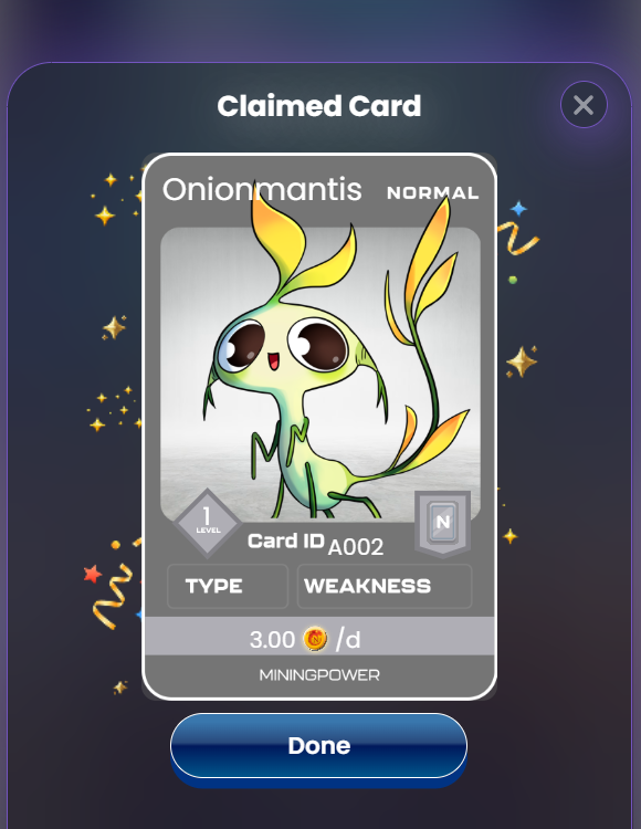 I have also collected an Onionmantis card. It is a normal card which is able to mine 3 NOVA toke s per day. I will use it in my deck to mine free NOVA tokens.