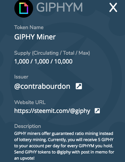 Description:GIPHY miners offer guaranteed ratio mining instead of lottery mining. Currently, you will receive 5 GIPHY to your account per day for every GIPHYM you hold. Send GIPHY tokens to @giphy with post in memo for an upvote!